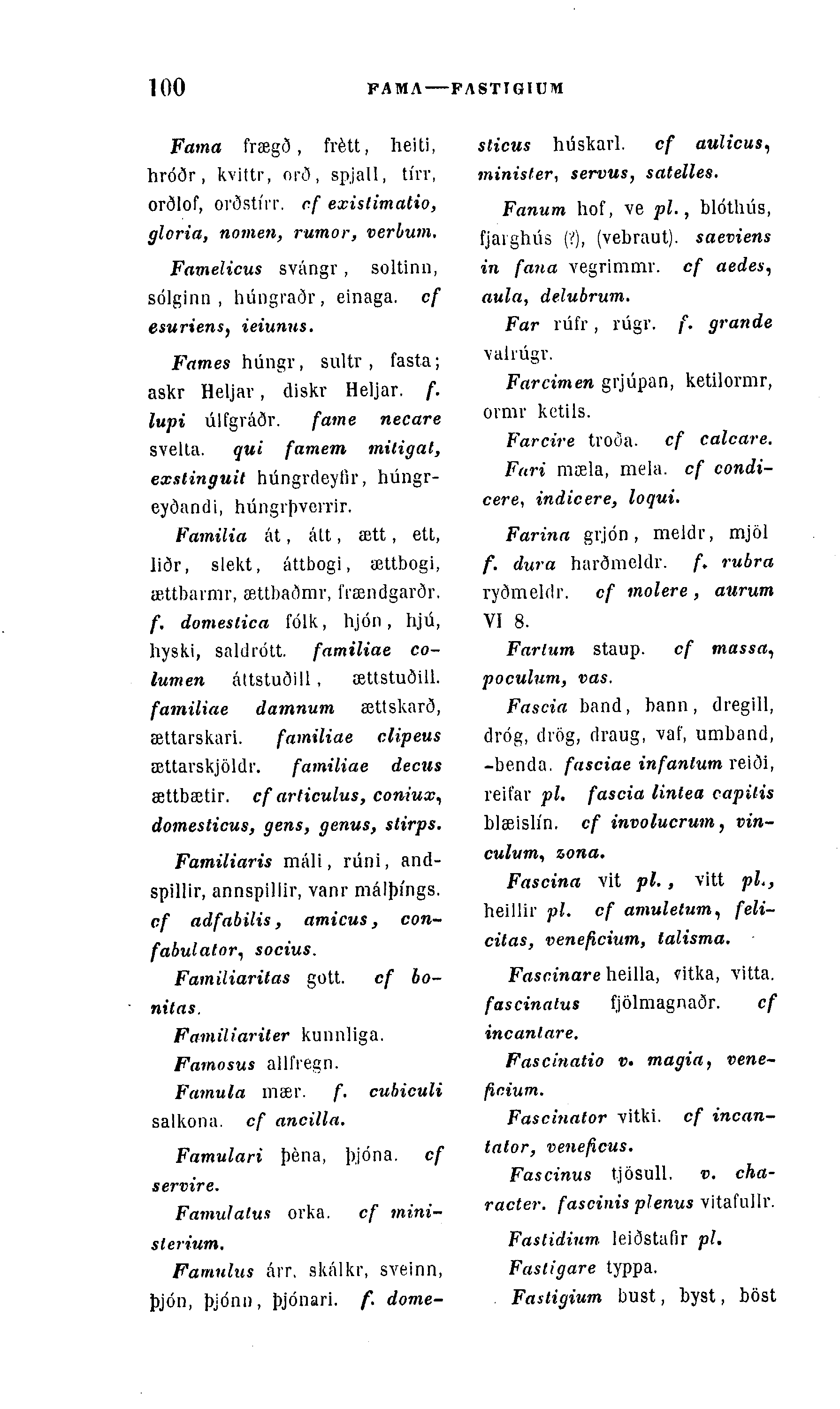 Familia át, ált, ætt, ett, liðr, slekt, áttbogi, ættbogi, ættbarmr, ættbaðmr, frændgarðr. f. domestica fólk, hjón, hjú, hyski, saldrótt. familiae co-lumen áttstuðill, ættstuðill. familiae damnum ættskarð, ættarskari. familiae clipeus ættarskjöldr. familiae decus ættbætir. cfarticulus, coniux, domesticus, gens, genus, stirps.