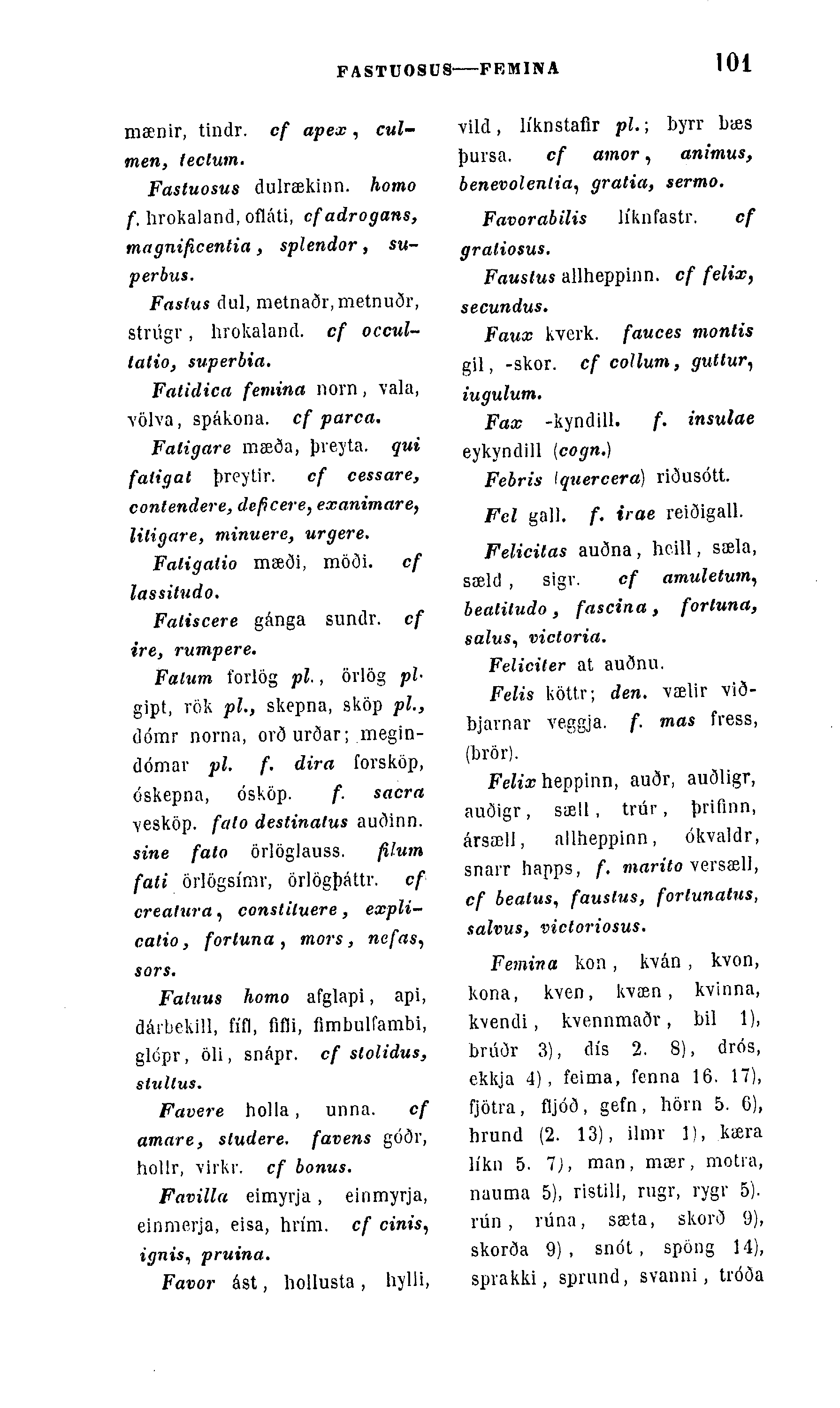 Falum i'orlög pl., övlög pl-gipt, rök pl., skepna, sköp pl., dómr norna, orð urðar; megin-dómar pl. f. dira forsköp, óskepna, ósköp. f. sacra vesköp. falo destinalus auðinn. sine fato örlöglauss. fihim fati örlögsímr, örlögþáttr. cf crealura, constiíuere , expli-calio, fortuna , mors, nefas, sors.
