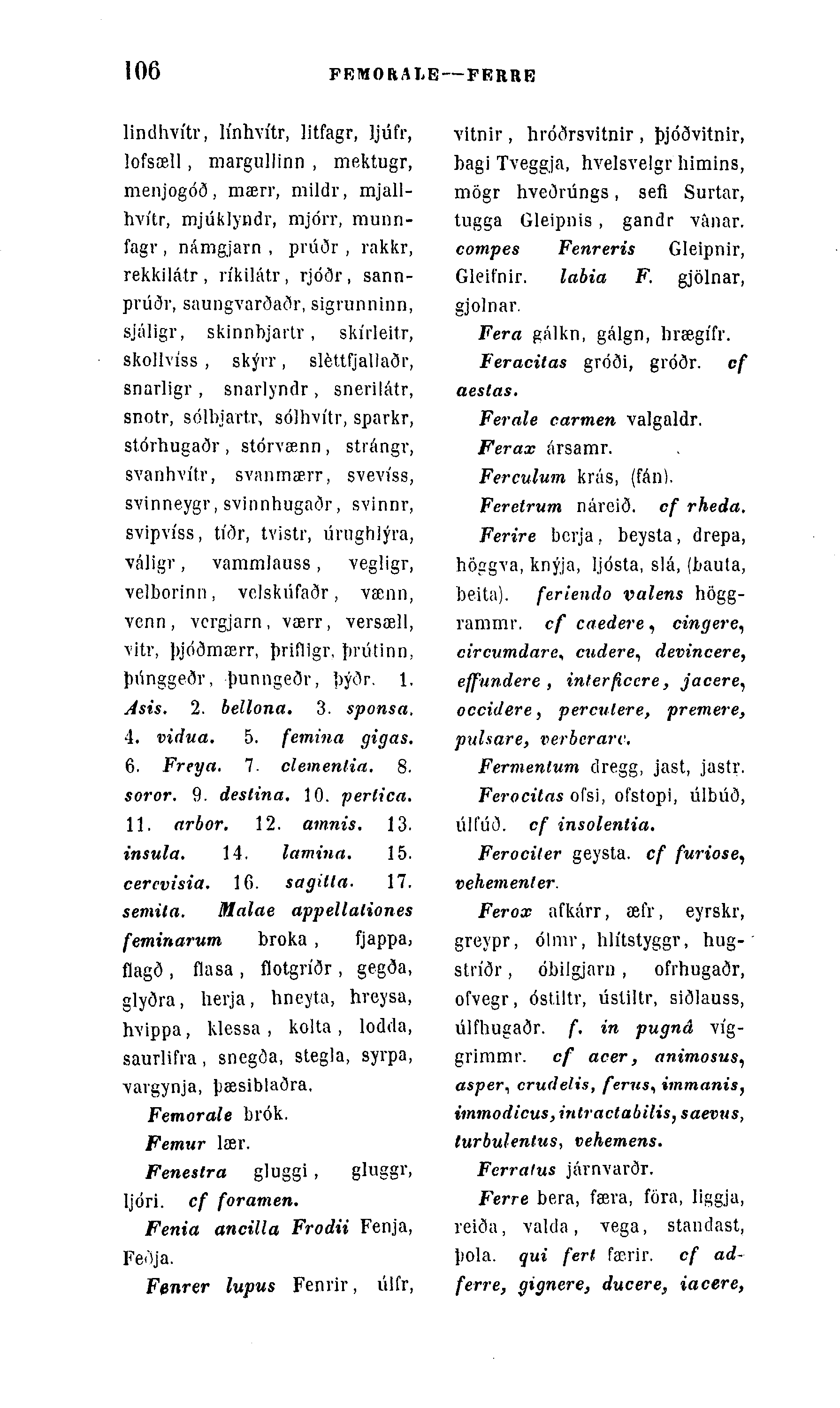 lindhvítr, línhvítr, litfagr, ljúfr, lofsæll, margullinn , mektugr, menjogóð, mærr, mildr, mjall-Iwi'tr, mjúklyndr, mjórr, munn-fagr , námgjarn , prúðr , rakkr, rekkilátr, ríkilátr, rjóðr, sann-pvúðr, saungvarðaðr, sigrunninn, sjáligr, skinnbjartr , skírleitr, skollvíss , skýrr, sléttfjallaðr, snarligr , snarlyndr , snerilátr, snotr, sólbjartr, sólhvítr, sparkr, stórhugaðr , stórvænn , strángr, svanhvítr, svanmærr, svevíss, svinneygr, svinnhugaðr, svinnr, svipvíss, tíðr, tvistr, úrughlýra, váligr, vammlauss, vegligr, velborinn, velskúfaðr, vænn, venn, vcrgjarn, værr, versæll, \itr, þjóðmærr, þrifllgr, prútinn, þringgeðr, -þunngeðr, þýðr. 1. Jsis. 2. bellona. 3. sponsa, 4. vidua. 5. femina gigas. 6. Freya. 7. clementia. 8. soror. 9. destina, 10. perfica. 11. arbor. 12. amnis, 13. insula. 14. lctmina. 15. cercvisia. 16. sagitla. 17. semila. Malae appellaliones feminarum broka , fjappa, flagð , flasa , flotgríðr , gegða, glyðra, herja, hneyta, hveysa, hvippa, klessa , kolta , lodda, saurlifra, snegða, stegla, syrpa, ■vavgynja, pæsiblaðra,
