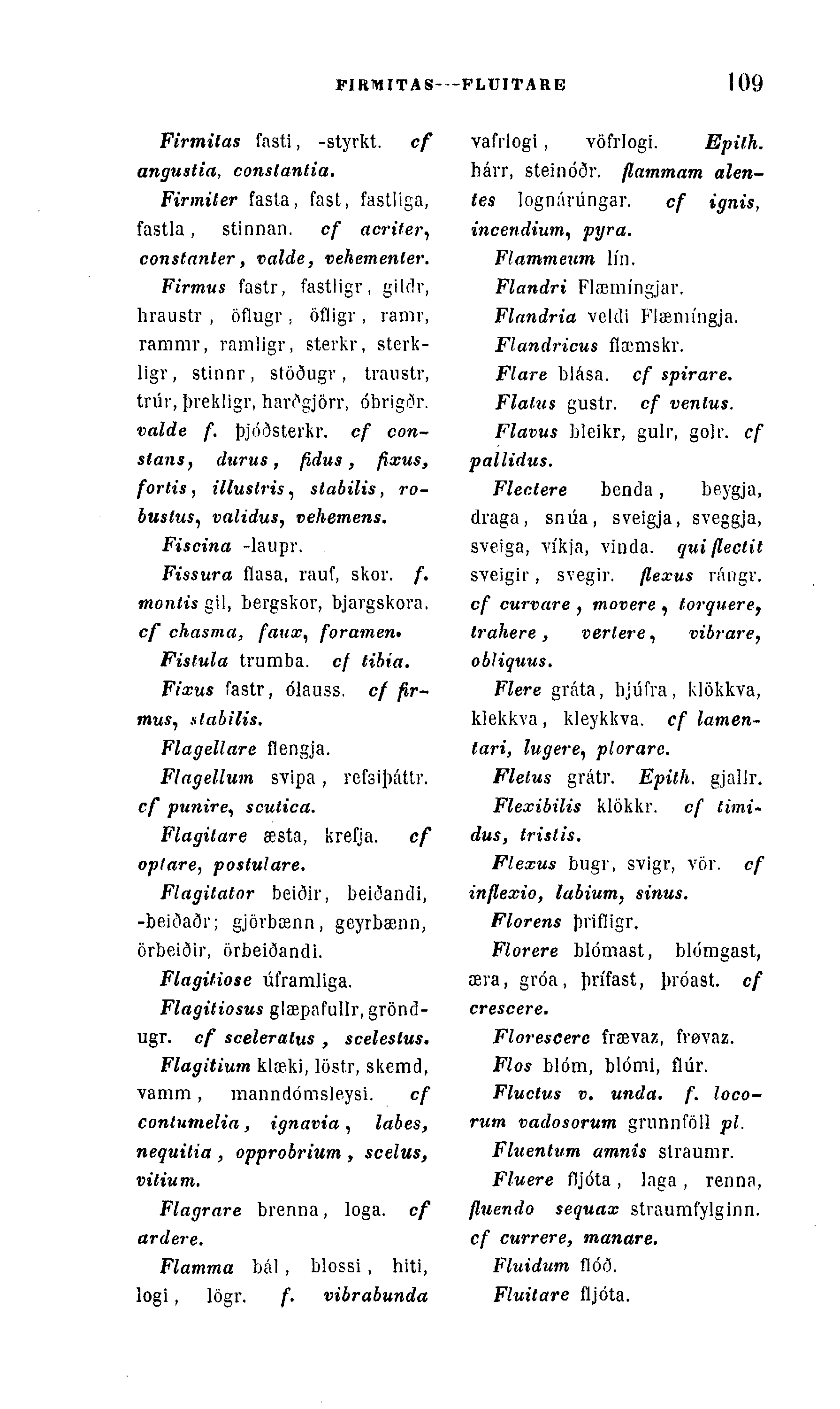 Firmus fastr, fastligr, gildr, hraustr , öflugr , öfligr , ramr, rammr, raraligr, sterkr, sterk-ligr, stinnr, stöðugr, traustr, trúr, þrekligr, harÃgjörr, óbrigðr. valde f. þjóðsterkr. cf con-slans, durus, fidus, fixus, fortis, illuslris, slabilis, ro-buslus, validus, vehemens.