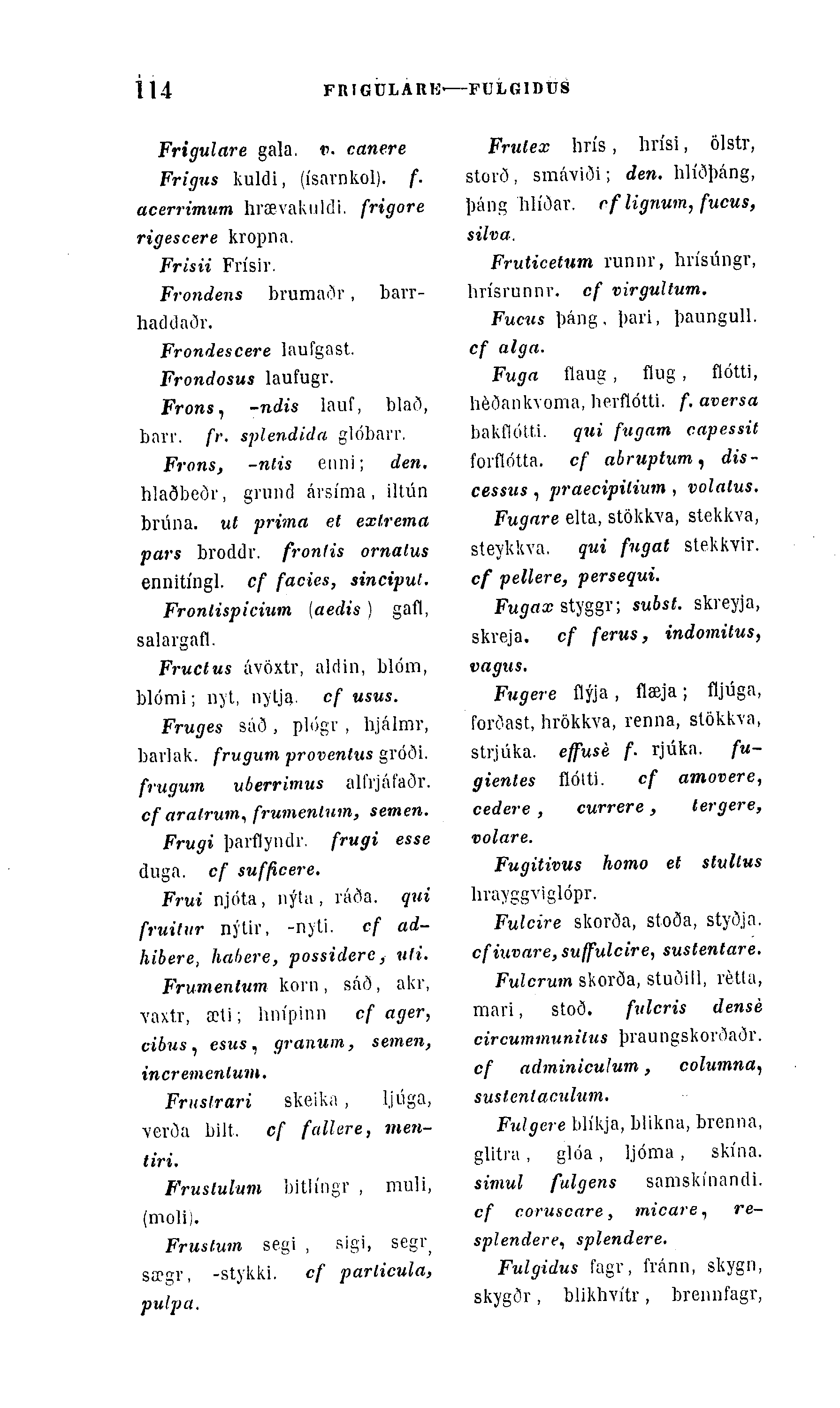 Frigulare gala. v. canere Frigus kuldi, (ísarnkol). f. acerrimum hrævakuldi. frigore rigescere kropna. Frisii Frísiv.