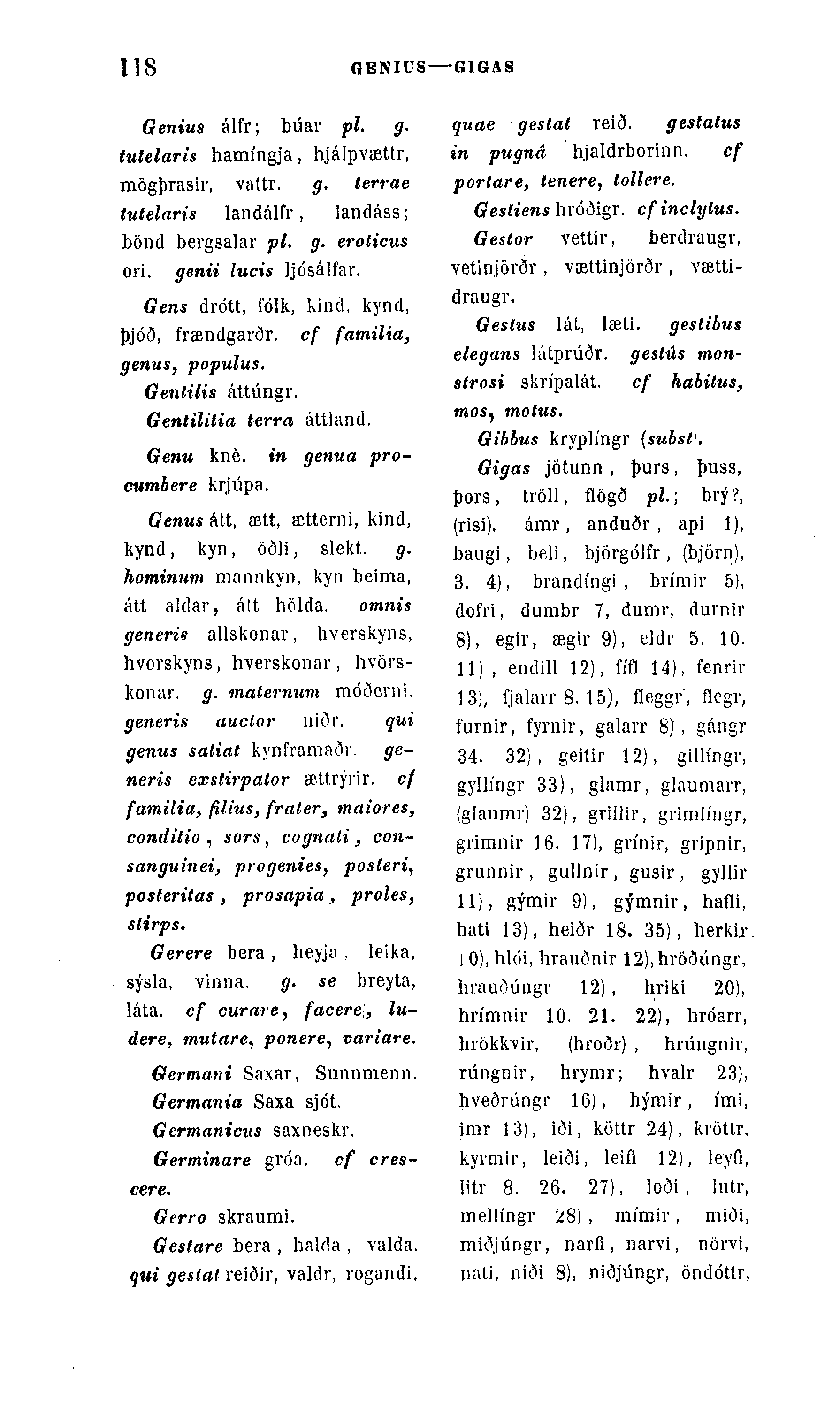 Genus átt, ætt, ætterni, kind, kynd, kyn, öðli, slekt. g. hominum mannkyn, kyn beima, átt aldar, ált hölda. omnis generis allskonar, hverskyns, hvorskyns, hverskonar, hvörs-konar. g. maternum móöevni. generis auclor niðr. qui genus saliat kynframaðv. ge-neris exstirpalor ættrýrir. cf familia, filius, frater, maiores, conditio , sors, cognati, con-sanguinei, progenies, posleri, posteritas , prosapia , proles, slirps.