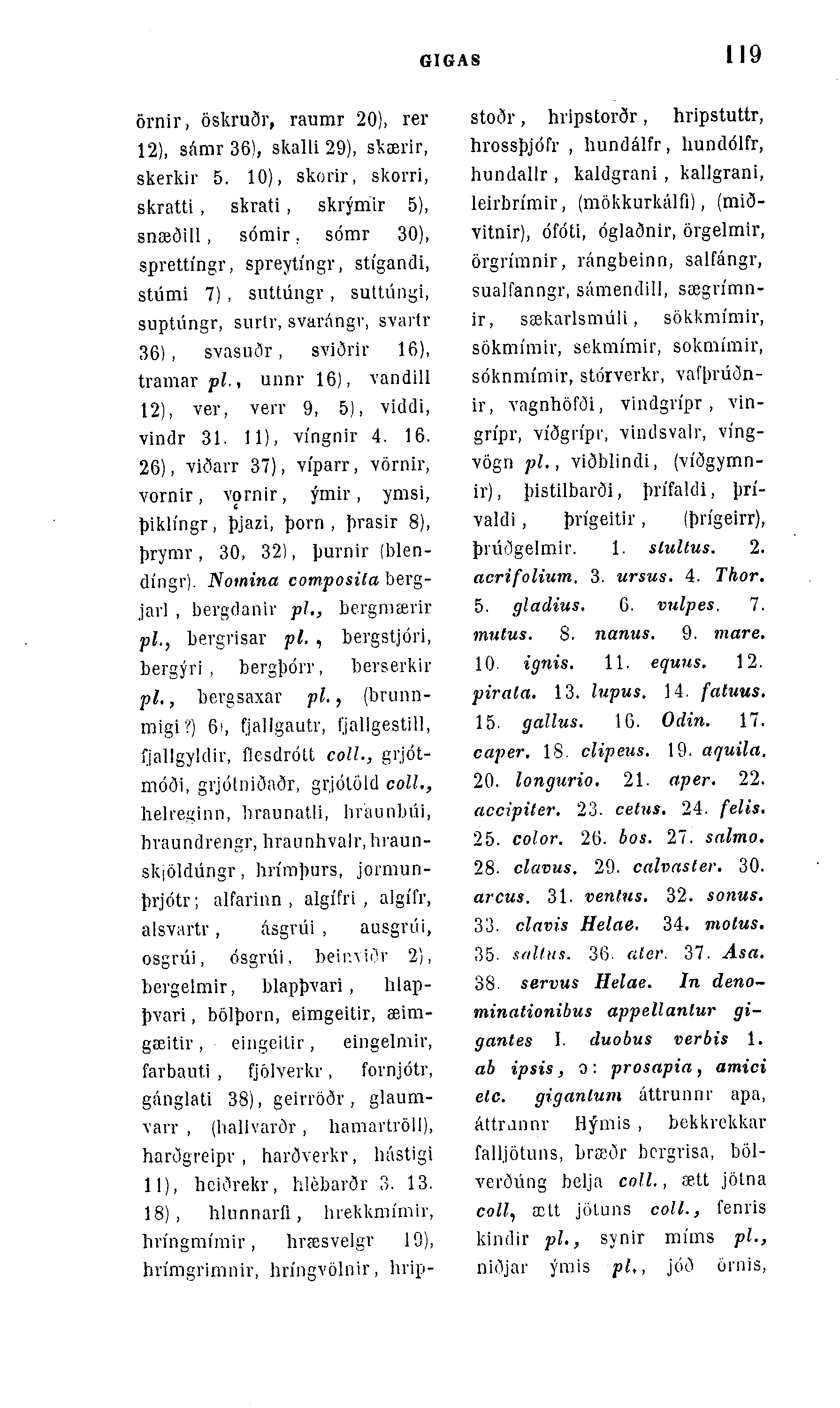 stoðr, hripstorðr, hripstuttr, hrossþjófr , hundálfr, hundólfr, hundallr , kaldgrani , kallgrani, leirbrÃmir, (mökkurkálfi), (mið-vitnir), ófóti, óglaðnir, örgelmÃr, örgrÃranir, rángbeinn, salfángr, sualfanngr, sámendill, sægvÃtnn-ir, sækarlsmúli, sökkmÃmir, sökmÃmir, sekmÃmir, soktnÃmir, sóknmÃmir, stórverkr, vafþrúðn-ir, vagnhöfði, vindgn'pr, vin-grÃpr, vÃðgn'pv, vindsvalr, vÃng-vögn pl., viðblindi, (vÃðgymn-ir), þistilbarði, þrÃfaldi, þrÃ-valdi, þrÃgeitir, (þrÃgeirr), þrúðgelmir. 1. slullus. 2. acrifolium, 3. ursus. 4. Thor. 5. gladius. 6. vulpes, 7. mutus. 8. nanus. 9. mare. 10. ignis. 11. equus. 12. pirata. 13. lupus. 14. fatuus. 15. gallus. 16. Odin. 17. caper. 18. clipeus. 19. aquila, 20. longurio. 21. aper. 22. accipiler. 23. cetus. 24. felis. 25. color. 26. bos. 27. salmo. 28. clavus. 29. calvasler. 30. arcus, 31. ventus. 32. sonus. 33. clavis Helae. 34. motus. 35. sfiltus. 36. fÃter. 37. Asa. 38. servus Helae. In deno-minationibus appellanlur gi-gantes I. duobus verbis 1. ab ipsis, o : prosapia, amici etc. giganlum áttrunnr apa, áttrannr Hýmis , bekkrekkar falljötuns, bræðr bcrgvisa, böl-verðúng belja coll., ætt jölna coll, ætt jöluns coll., fenris kindir pl., synir mÃms pl., niðjar ýrais pl,, jóð örnis,