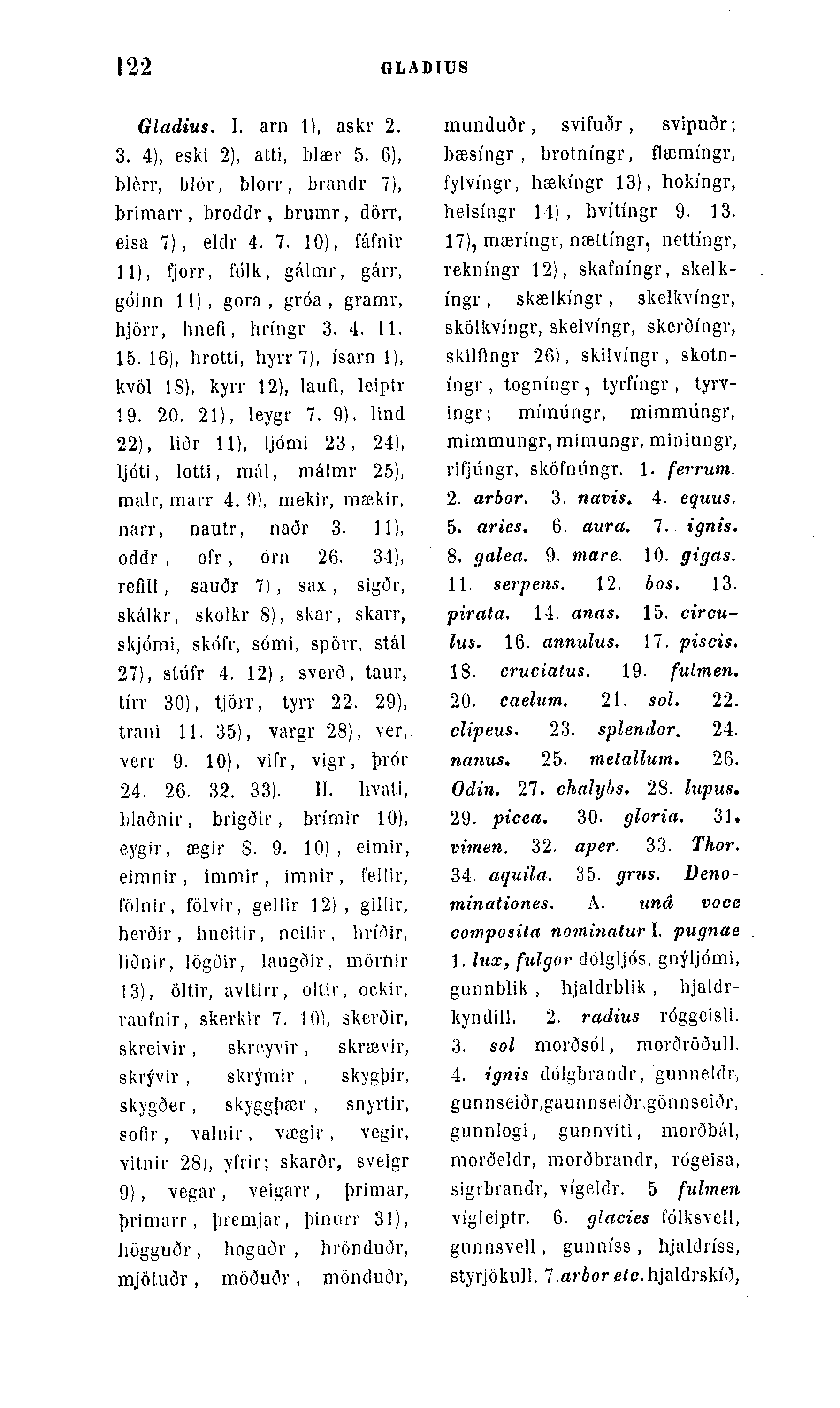 2. arbor. 3. navis, 4. equus. 5. aries. 6. aura. 7. ignis. 8. galea. 9. mare. 10. gigcts. 11. serpens. 12. bos. 13. pirata. 14. anas. 15. circu-lus. 16. annulus. 17. piscis. 18. cruciatus. 19. fulmen. 20. caelum. 21. sol. 22. clipeus. 23. splendor. 24. nanus. 25. melallum. 26. Odin. 27. chalybs. 28. lupus. 29. picea. 30. gloria. 31. vhnen, 32. aper. 33. Thor. 34. aquila. 35. grus. Deno-minationes. A. uná voce composila nominatur I. pugnae 1. lux, fulgor dólgljós, gnýljómi, gunnblik , hjaldrblik, hjaldr-kyndill. 2. radius róggeisli.