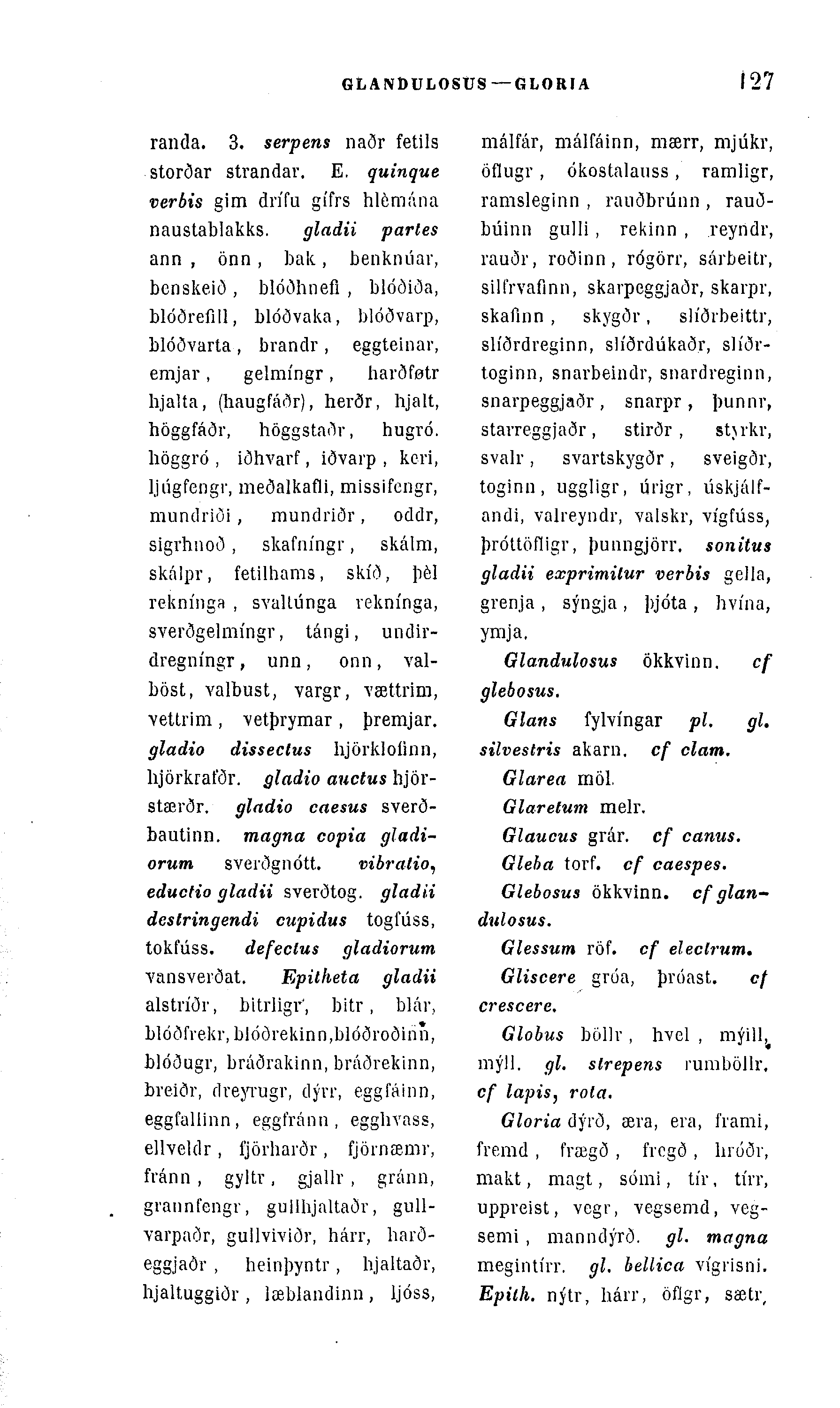 randa. 3. serpens naðr fetils storðar strandar. E. quinque verbis gim drÃfu gÃfrs hlemána naustablakks. gladii partes ann , önn , bak, benknúar, benskeiö , blóðhnefl , blóðiða, blóðrefill, blóðvaka, blóðvarp, blóðvarta , brandr , eggteinar, emjar, gelmÃngr, harðfotr hjalta, (haugfáðr), herðr, hjalt, höggfáðr, höggstarir, hugró. höggró , iðhvarf, iðvarp , kcri, ljúgfengr, meðalkafli, missifengr, mundriði, mundriðr, oddr, sigrhnoð , skafnÃngr, skálm, skálpr, fetilhams, skÃð, þél reknÃnga , svaUúnga veknÃnga, sverðgelmÃngr, tángi, undir-dregnÃngr, unn , onn, val-böst, valbust, vargr, yættrim, vettrim , •vetþrymar , þremjar. gladio dissectus hjörklolinn, lijörkrafðr. gladio auctus hjör-stærðr. gladio caesus sverð-bautinn. magna copia gladi-orum sverðgnótt. vibralio, eductio gladii sverðtog. gladii deslringendi cupidus togfúss, tokfúss. defeclus gladiorum â– vansverðat. Epitheta gladii alstrÃðr, bitrligr', bitr, blár, blóðfvekr, blóðrekinn,blóðroðinn, blóðugr, bráðrakinn, bráðrekinn, breiðr, dreyrugr, dývr, eggfáinn, eggfallinn, eggfránn , egghvass, ellveklr , fjörharðr , fjörnæmr, fránn , gyltr, gjallr , gránn, grannfengr, gullhjaltaðr, gull-varpaðr, gullviviðr, hárr, harð-eggjaðr , heinþyntr, hjaltaðr, hjaltuggiðr , læblandinn , ljóss,