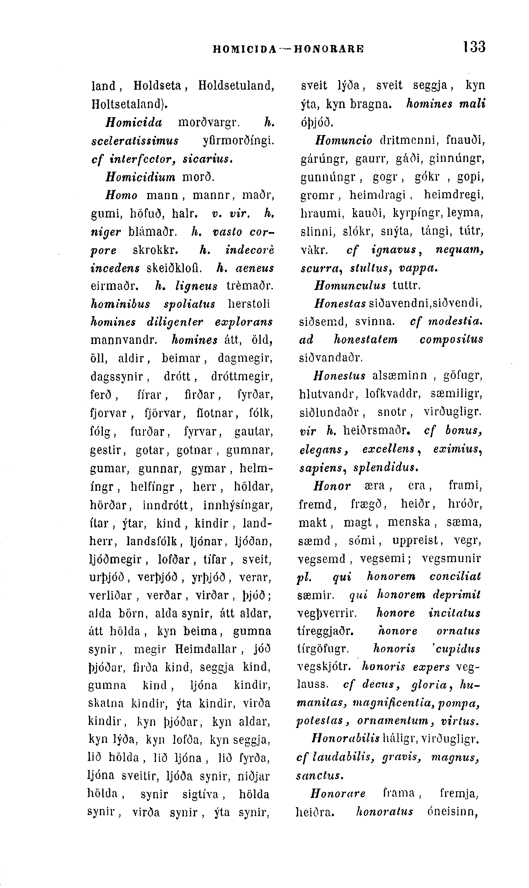 Honor æra, era, frami, fremd, frægð, heiðr, hróðr, makt, magt, menska , sæma, sæmd , sómi, uppreist, vegr, vegserad , vegsemi; vcgsmunir pl. qui honorem conciliat sæmir. qui honorem deprimit vegþvevrir. honore incitaÃus tÃreggjaðr. honore ornatus tÃrgöfugr. honoris 'cupidus vegskjótr. honoris expers veg-lauss, cf decus, gloria, hu-manitas, magnificentia, pompa, poteslas, ornamenlum, virtus. Honorabilis háligr, viröugligr. cf laudabilis, gravis, magnus, sanctus.