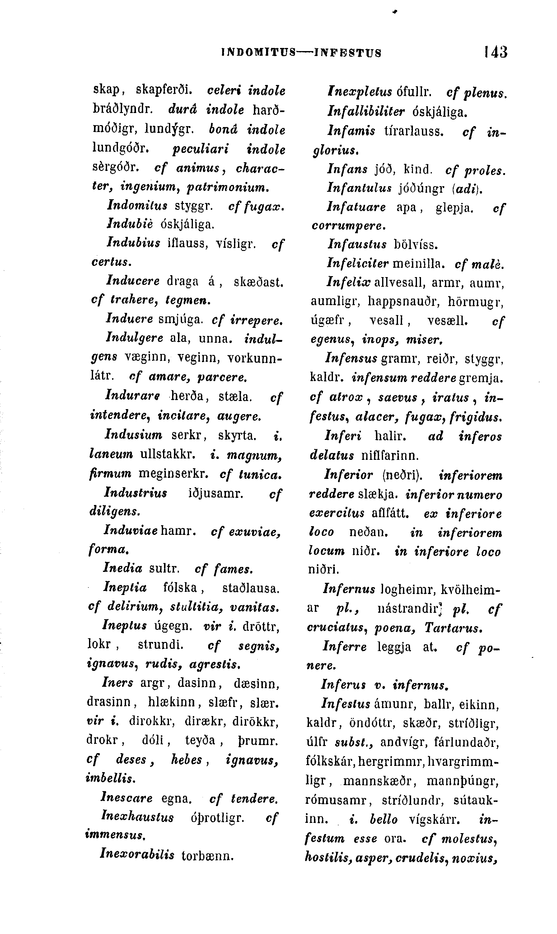 skap, skapferði. celeri indole bráðlyndr. durá indole harð-móðigr, lundýgr. boná indole lundgóðr. peculiari indole sérgóðr. cf animus, charac-ter, ingenium, patrimonium.