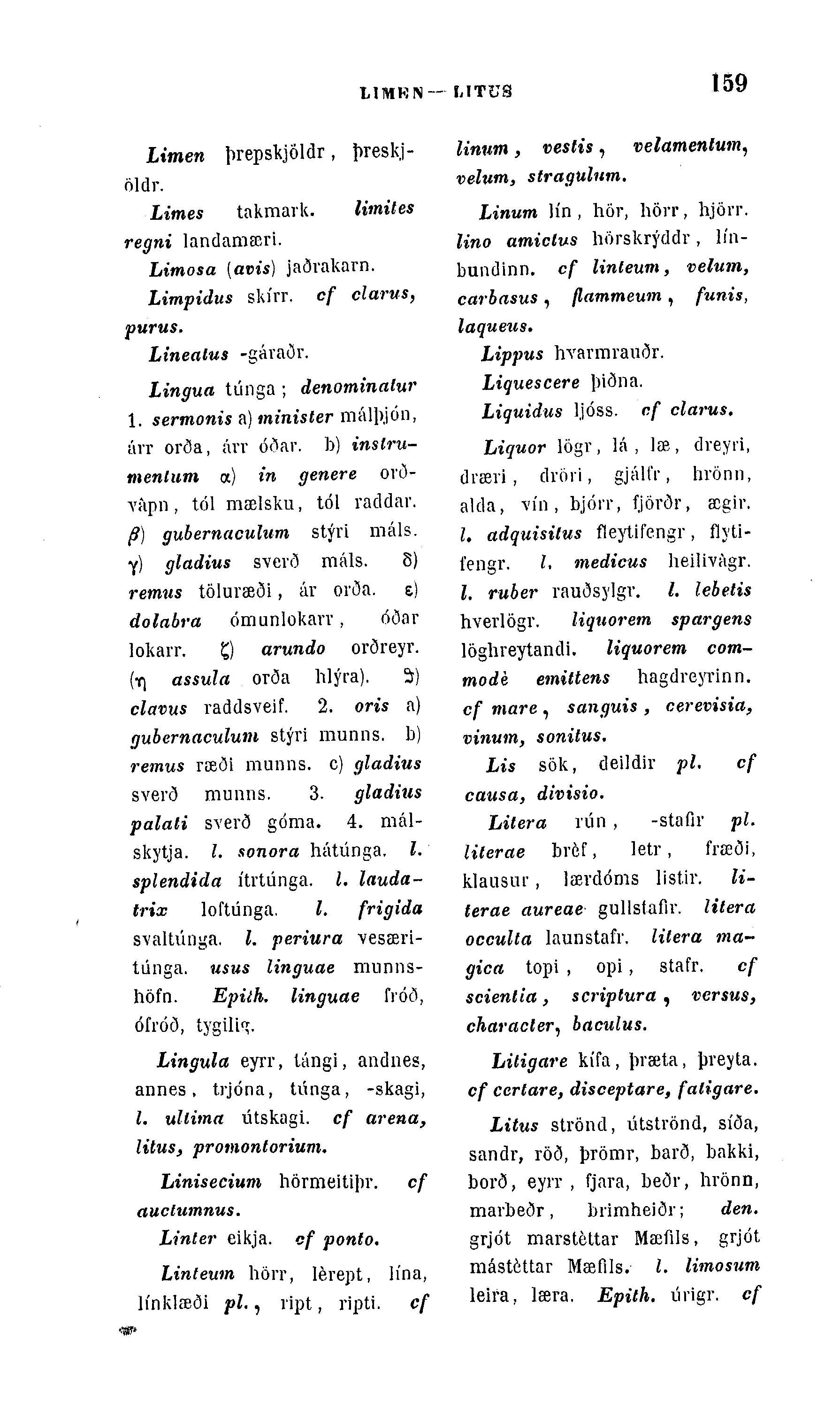 Litera rún , -staÃir pl. literae bvéf, letr, frœði, klausiu1, lævdóms listir. li-terae aureae gullstaflr. litera occulta launstafr. litera ma-gica topi , opi, stafr. cf scienlia, scriptura , versus, characler, baculus.