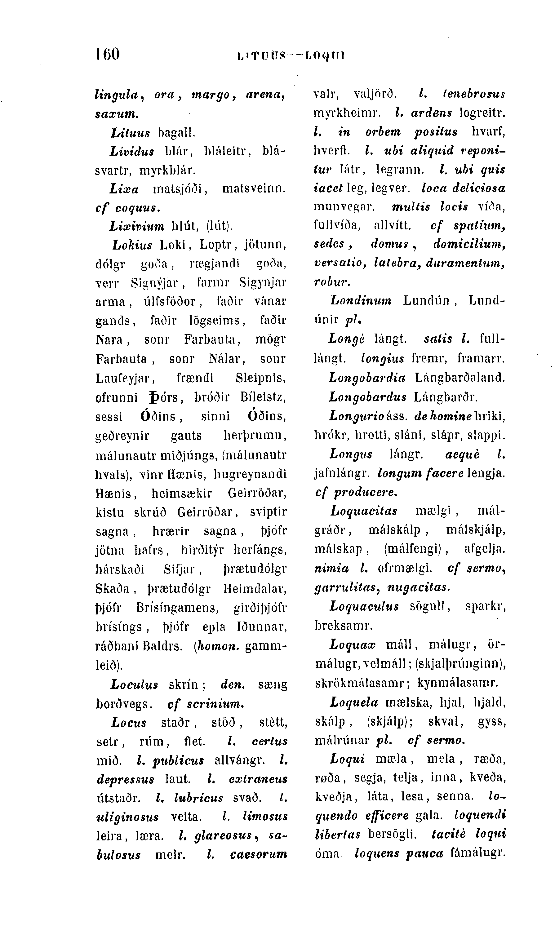 Locus staðr, stöð , stétt, setr, rúm, flet. l. cerlus mið. l. publicus allvángv. l, depressus laut. l. exlraneus útstaðr. l. lubricus svað. l. uliginosus veita. l. limosus leira, læra. l. glareosus, sa-bulosus meli'. l. caesorum