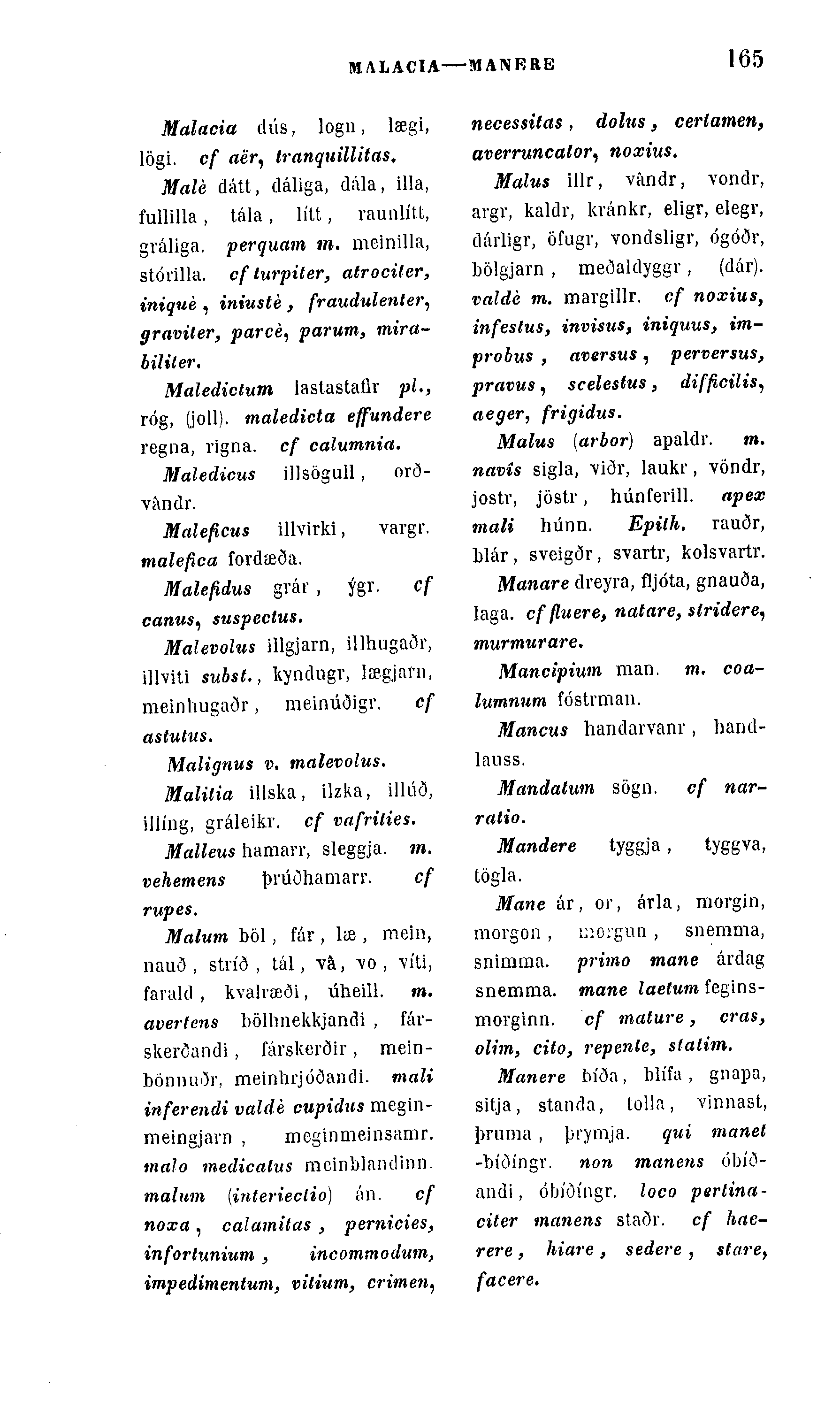 Malwn böl, fár , læ , mein, nauð , stn'ð , tál, va, "vo , \Ãti, faruld , kvalvæði, úheill. m. avertens bölhnekkjandi , fár-skerðandi, fárskerðir, mein-bönnuör, meinhrjóðandi. mali inferendi valdé cupidus megin-meingjarn , meginmeinsamr. malo medicatus meinblandinn. malum (interieclio) án. cf noxa , calamitas , pernicies, infortunium , incommodum, impedimentum, vitium, crimen.
