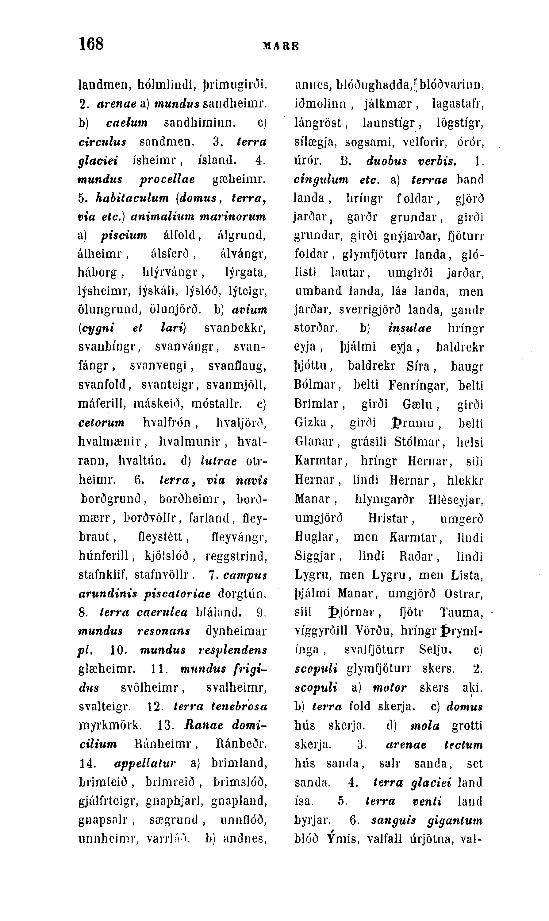 landmen, hólmliudi, þrimugirði. 2. arenae a) mundvs sandheimr. b) caelum sandhiininn. c) circulus sandmen. 3. terra glaciei Ãsheimr, Ãslantl. 4. mundus procellae gæheimr. 5. habitaculum (domus, terra, via etc.) animalium marinorum a) pisciwn álfold, álgrund, álheimr, álsferð , álvángv, háborg, hlýrvángr, lýi'gata, lýsheimr, lýskáli, lýslóð, lýteigr, ölungrund, ölunjörð. b) avium {cygni et lari) svanbekkr, svanbÃngr, svanvángr, svan-fángr, svanvengi, svanflaug, svanfold, svanteigr, svanmjöll, máferill, máskeið, móstallr. c) celorum hvalfrón , livaljörö, hvalmænir, hvalmunir , hval-rann, hvaltún. d) lulrae otr-heimr. 6. lerra, via navis borðgrund, borðheimr , borð-mÅ“rr, borÖYöllr, farland, fley-braut, fleystétt, fleyvángr, húnferill, kjöislóð , reggstrind, stafnklif, stafnvöllr. l.campus arundinis piscaloriae dorgtún. 8. terra caerulea bláland. 9. mundus resonans dynheimar pl, 10. tnundus resplendens glæheimr. 11. mundus frigi-dns svölheimr, svalheimr, svalteigr. 12. terra tenebrosa myrkmörk. 13. Ranae dotni-cilium Ránheimr, Ránbeðr. 14. appellatur a) brimland, briraleið , brimreið , brimslóð, gjálfi'teigv, gnaphjaii, gnapland, guapsalr , sægrund , unnflóð, unnhcimr, varrliVX b) anclnes,