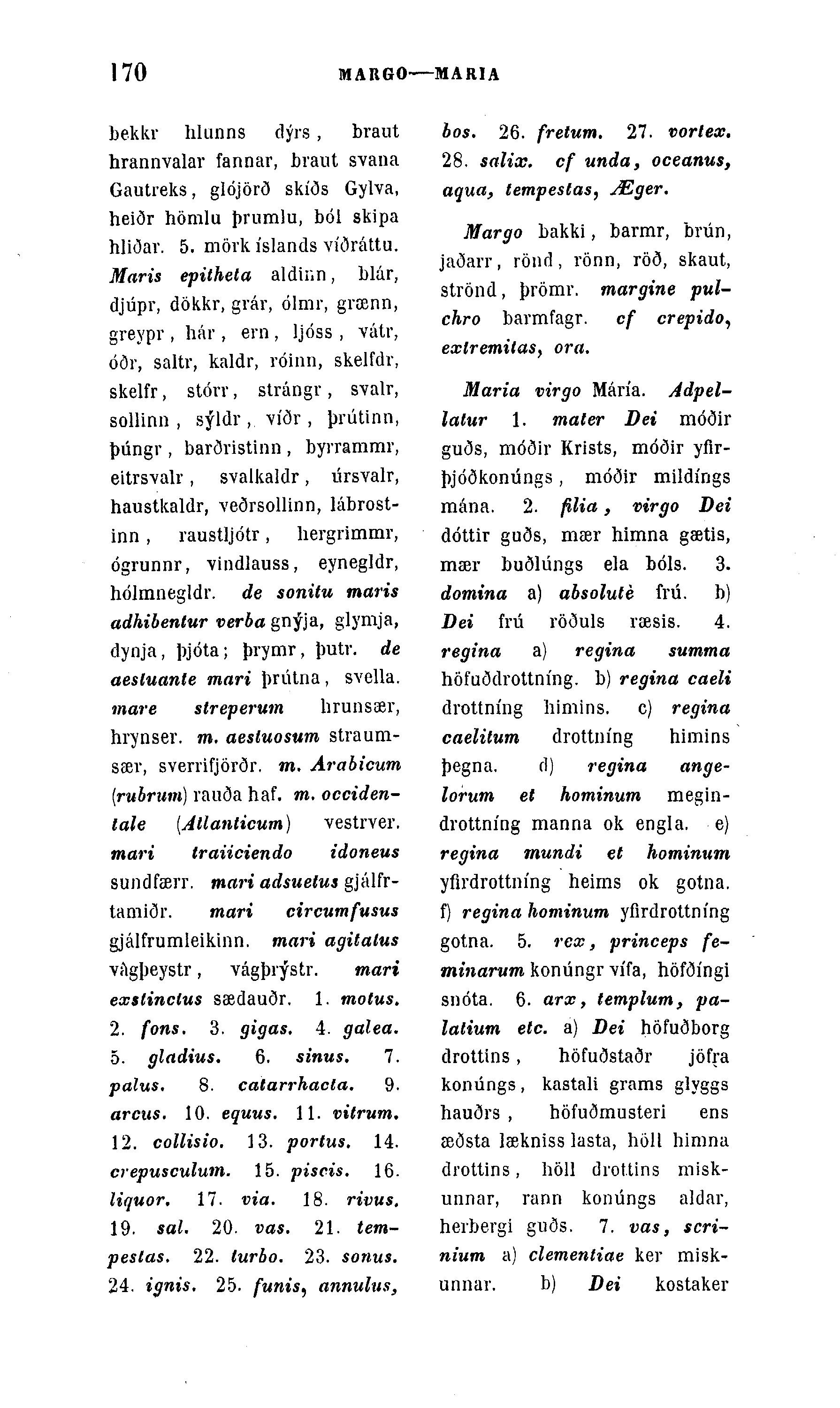 bekkr hlunns dýrs , braut hrannvalar fannar, braut svana Gautreks, glójörð skíðs Gylva, heiðr hömlu þrumlu, ból skipa hliðar. 5. mövk íslands víðráttu. Maris epitheta aldinn, blár, djúpr, dökkr, grár, ólmr, grænn, greypr , hár , ern , Ijóss , vátr, óðr, saltr, kaldr, róinn, skelfdr, skelfr, stórr, strángr , svalr, sollinn , sýldr , víðr , þrútinn, þúngr , barðristinn , byrrammr, eitrsvalr, svalkaldr, úrsvalr, haustkaldr, veðrsollinn, lábrost-inn, raustljótr, hergrimmr, ógrunnr, vindlauss, eynegldr, hólmnegldr. de sonitu maris adhibentur verba gnýja, glymja, dynja, þjóta; þrymr, þutr. de aesluante mari þrútna, svella. mare streperum lirunsaer, hrynser. m, aesluosum straum-sær, sverrifjörðr. m. Arabicum (rubmm) rauða haf. m. occiden-lale (Atlanticum) vestrver. mari traiiciendo idoneus sundfærr. mari adsuelus gjálfr-tamiðr. mari circumfusus gjálfrumleikinn. mari agitalus víigþeystr, vágþrýstr. mari exslinclus sædauðr. 1. motus. 2. fons. 3. gigas. 4. galea. 5. gladius. 6. sinus. 7. palus. 8. catarrhacla. 9. arcus. 10. equus. 11. vitrum. 12. collisio. 13. portus, 14. crepusculum. 15. piscis. 16. liquor. 17. via. 18. rivus. 19. sal. 20. vas. 21. tetn-pestas. 22. lurbo. 23. sonus. 24. ignis. 25. funis, annulus,