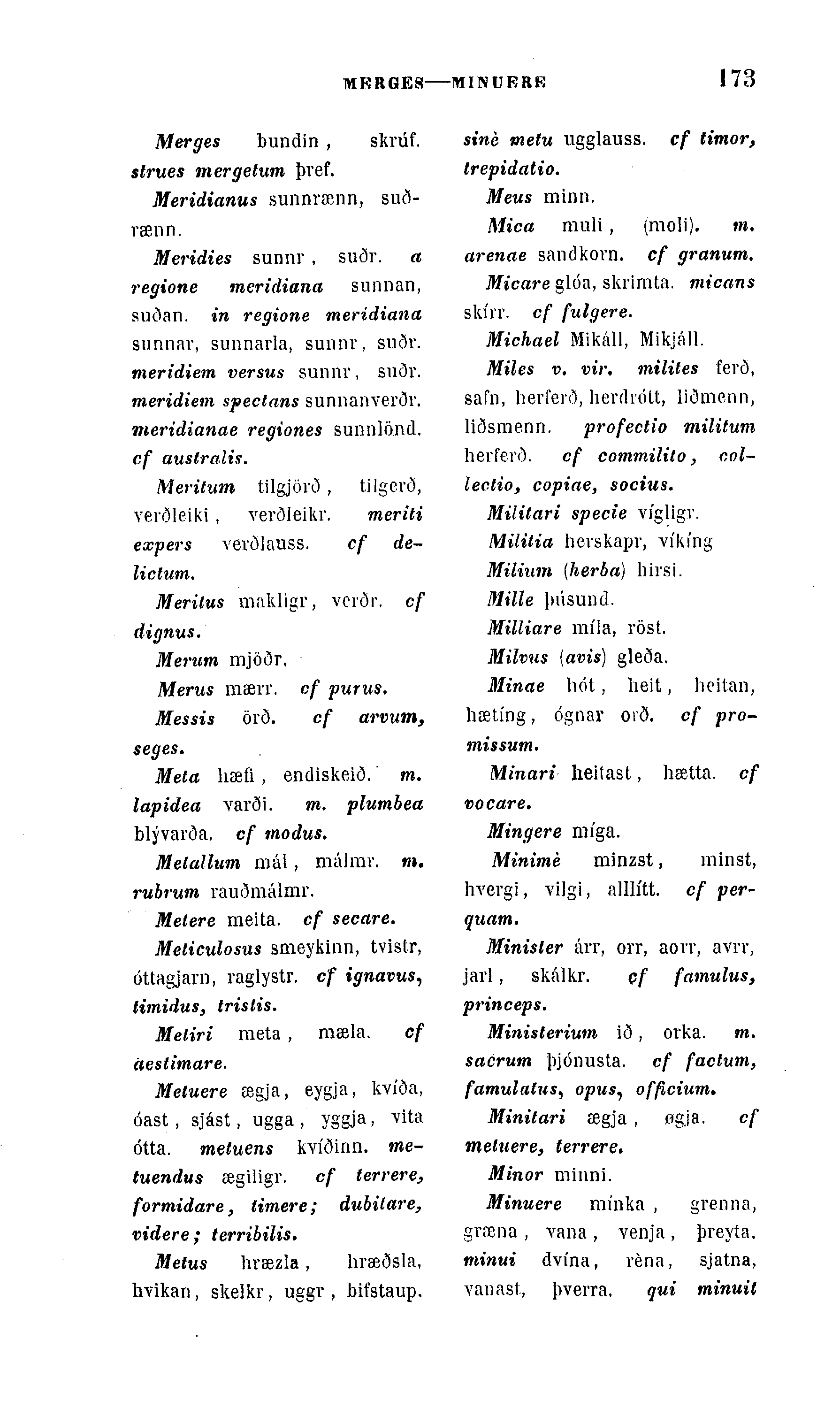 Meridies sunnr , suðr. a regione meridiana sunnan, suðan. in regione meridiana snnnav, sunnarla, sumir, suðv. meridiem versus sunnr, snðr. meridiem speclans sunnanverðr. meridianae regiones sunnlönd. cf ausíralis.