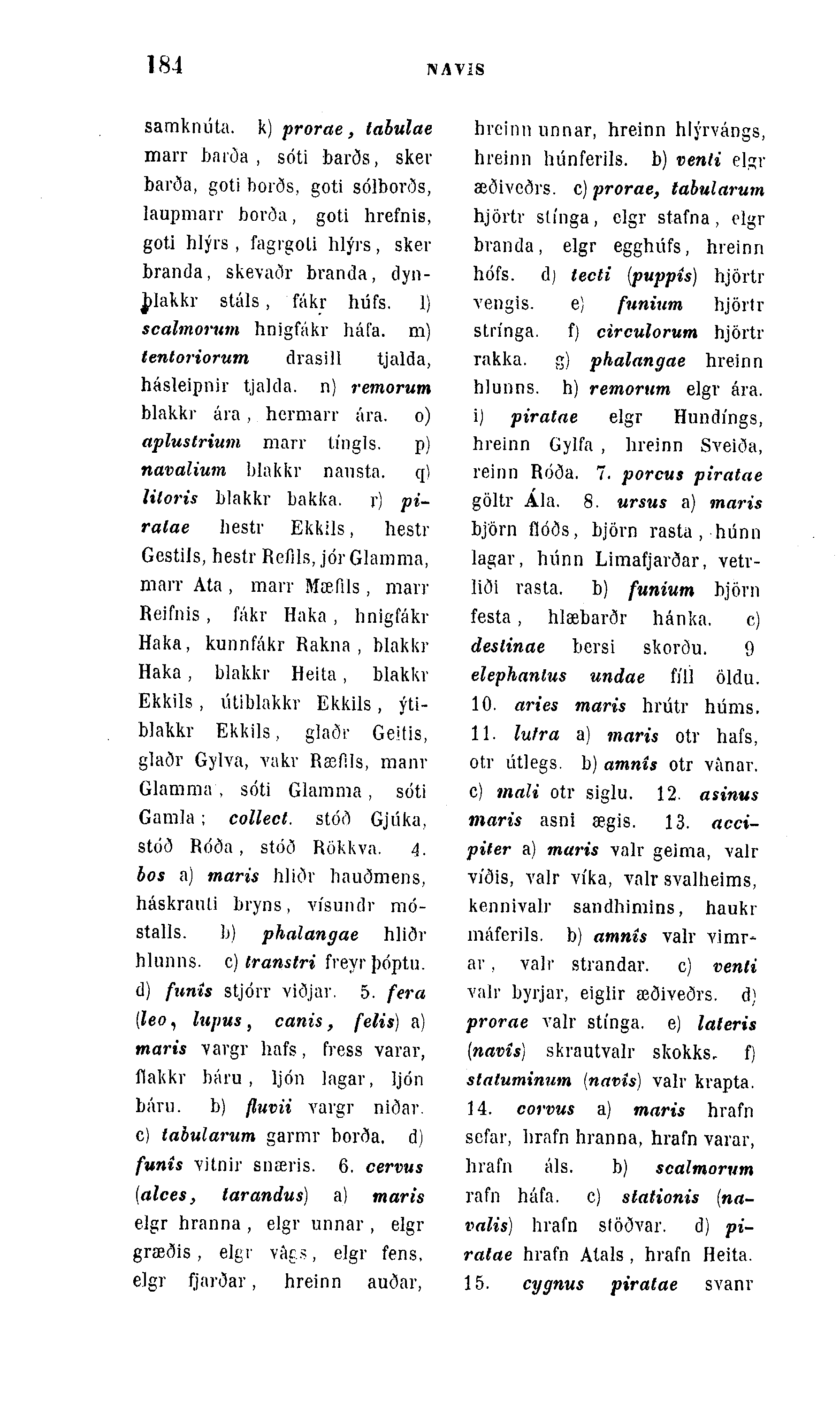 samknúta. k) prorae, tabulae maiT barða , sóti barðs, sker barða, goti borðs, goti sólborðs, laupmarr borða, goti hrefnis, goti hlýrs , fagrgoli hlýis, sker branda, skevaðr branda, dyn-J>Iakkr stáls, fákr húfs. 1) scalmorum hnigfákr háfa. m) tentoriorum drasill tjalda, hásleipnir tjalda. n) remorum blakkr ára, hermarr ára. o) aplustrium marr tÃngls. p) navalium blakkr nansta. q) litoris blakkr bakka. r) pi-ralae liestr Ekkils, hestr GestiJs, hestr Refils, jór Glamma, marr Ata , marr Mæfils, marr Reifnis , fákr Haka , lmigfákr Haka, kunnfákr Rakna , blakkr Haka, blakkr Heita, blakkv Ekkils , lÃtiblakkv Ekkils, ýti-blakkr Ekkils, glaðr Geitis, glaðr Gylva, vakv Ræfils, manv Glamma , sóti Glamma , sóti Gamla ; collect. stór) Gjúka, stóð Róða , stóð Rökkva. 4. bos a) maris hliðr hauðmens, háskrauli bryns, vÃsundr mó-stalls. b) phalangae hliðr hlunns. c) transtri freyrþóptu. d) funis stjórr viðjar. 5. fera [leo, lujius, canis, felis) a) maris "vargr liafs, fress varar, flakkr báru , ljón lagar, Ijón báru. b) fluvii vargr niðar. c) iabularnm garmr borða. d) funis Yitnir snæris. 6. cervus (alces, tarandus) a) maris elgr hranna , elgr unnar , elgr græðis, elgr vács, elgr fens, elgr fjarðar, hreinn auðar,