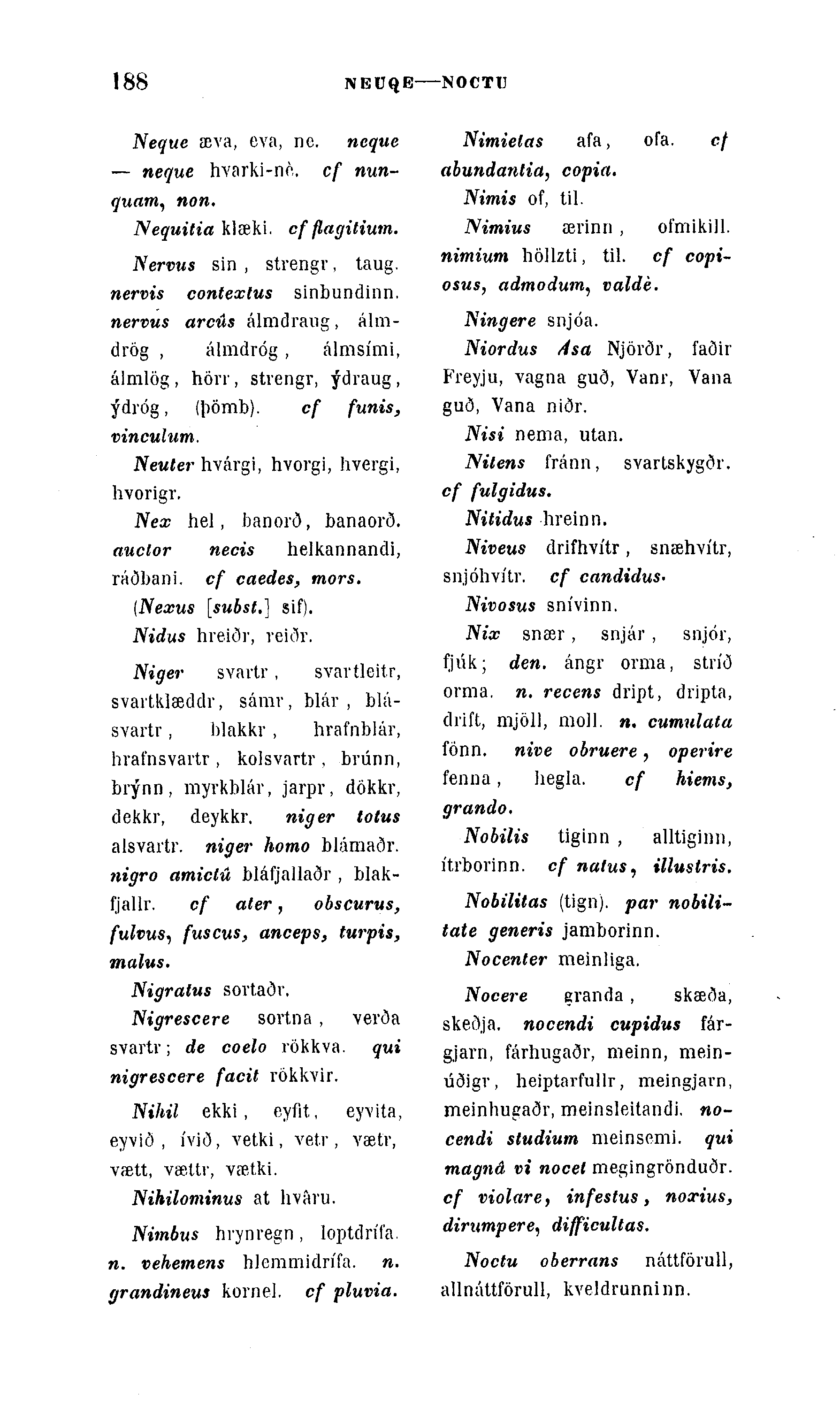 Niger svavtr, svavtleitr, svartklæddr, sárar, blár , blá-svartr, blakkr , hrafnblár, hrafnsvartr , kolsvartr , brúnn, brýnn, myrkblár, jarpr, dökkr, dekkr, deykkr, niger totus alsvartr. niger hotno blámaðr. nigro amictú bláfjallaðr , blak-fjallr. cf aler, obscurus, fulvus, fuscus, anceps, turpis, malus.