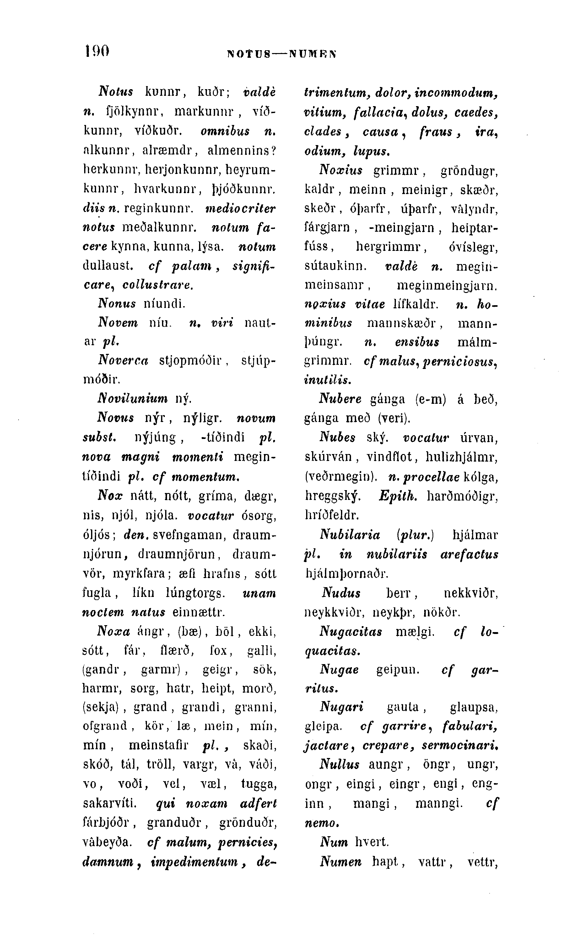 Noxa ángr, (bæ), böl, ekki, sótt, fár, flærð, i'ox, galli, (gandr, garmr) , geigr, sök, harmr, sorg, hatr, heipt, morð, (sekja) , grand , grandi, granni, ofgrand , kör, læ, mein, mÃn, mÃn , meinstaflr pl. , skaði, skóð, tál, tröll, vavgr, vá, váði, vo, voði, vel, yæl, tugga, sakarvÃti. qui noxam adfert fárLjóðr , granduðr , grönduðr, vabeyða. cf malum, pernicies, damnutn , impedimenlum , de-