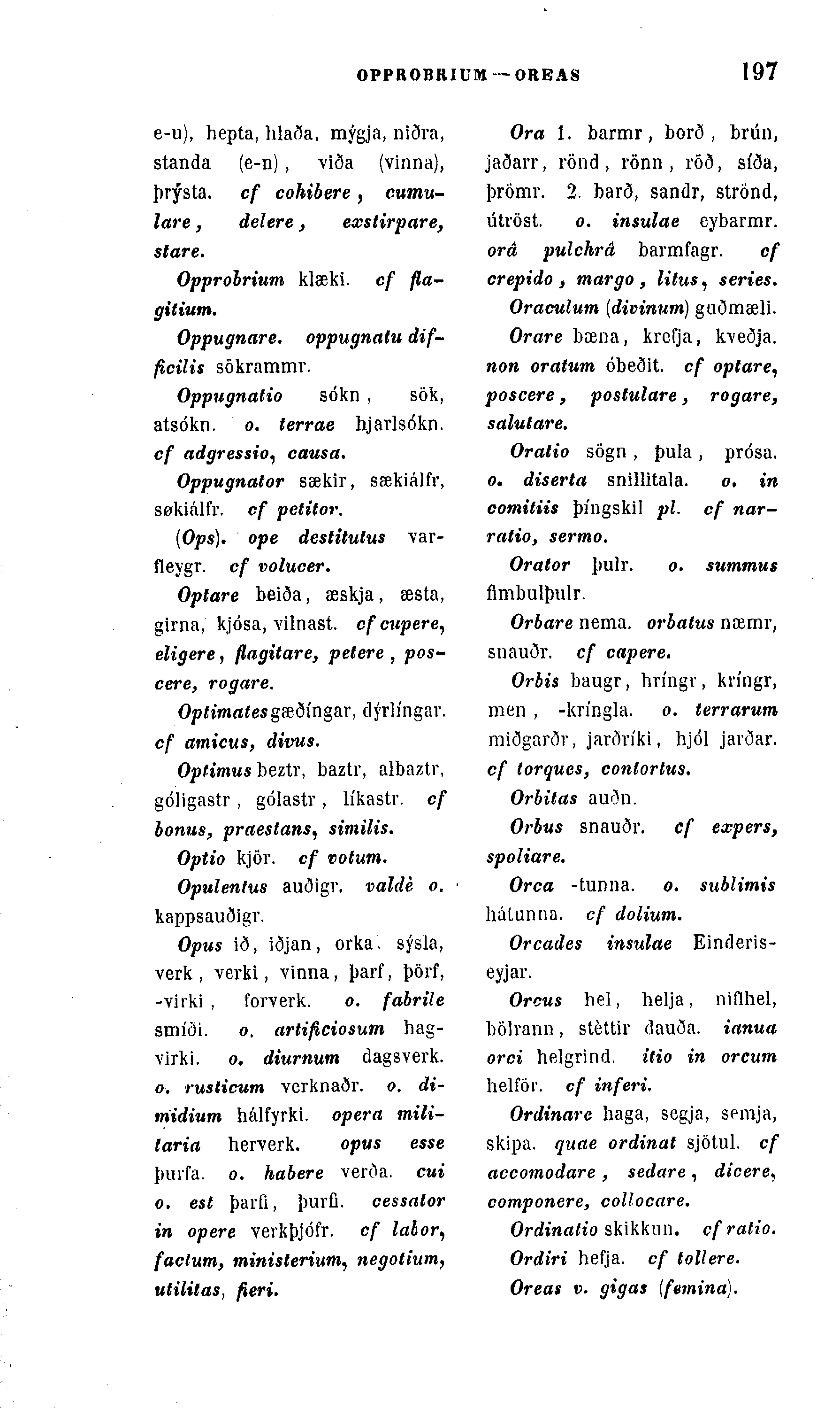Opus ið, iðjan, orka. sýsla, verk , verki, vinna, þarf, þörf, -viiki , forverk. o. fabrile smíöi. o. artificiosum hag-virki. o. diurnum dagsverk. o. rusticum verknaðr. o. di-midium hálfyrki. opera mili-taria herverk. opus esse þuifa. o. habere verða. cui o. est þarfi, þurfi. cessator in opere verkþjófr. cf lalor, faclum, ministerium, negotium, utilitas, fieri.