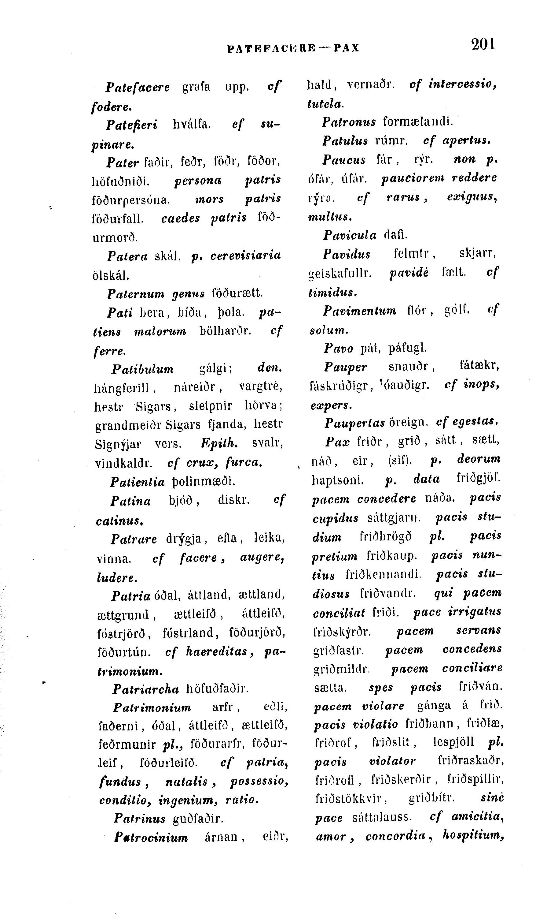 Pax friðr, grið , sátt, sætt, náö, eir, (sif). p. deorum haptsoni. p, data friðgjöf. pacem concedere náða. pacis cupidus sáttgjarn. pacis stu-diutn friðbrögð pl. pacis pretium friðkaup. pacis nun-tius friðkennandi. pacis stu-diosus friðvandr. qui pacem conciliat friði. pace irrigalus l'riðskýrðr. pacem servans griðFasU'. pacem concedens griðmildr. pacem conciliare sælta. spes pacis friðván. pacem violare gánga á frið. pacis violatio friðbann, friðlæ, friðrof, friðslit, lespjöll pl. pacis violator friðraskaðr, friörofi , friðskerðir , friðspillir, friðstökkvir, griðbítr. siné pace sáttalauss. cf atnicitia, amor , concordia, hospitium,