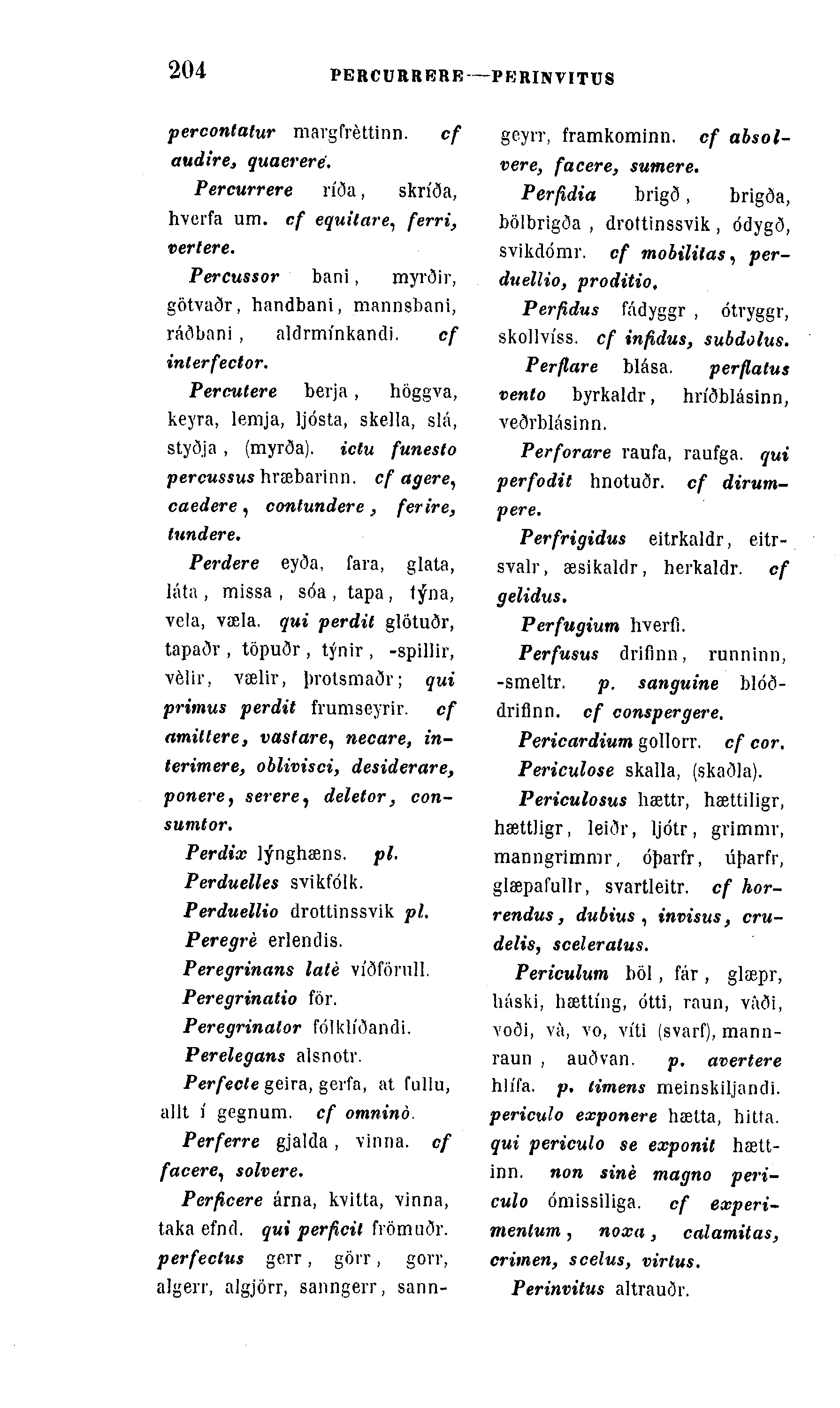 Perdere eyða, fara, glata, láta , missa , sóa , tapa, týna, vela, væla. qui perdit glötuðr, tapaðr , töpuðr , týnir , -spillir, vélir, vælir, þrotsmaðr; qui primus perdit frumseyrir. ef amiltere, vasfare, necare, in-terimere, oblivisci, desiderare, ponere, serere^ deletor, con-sumtor.
