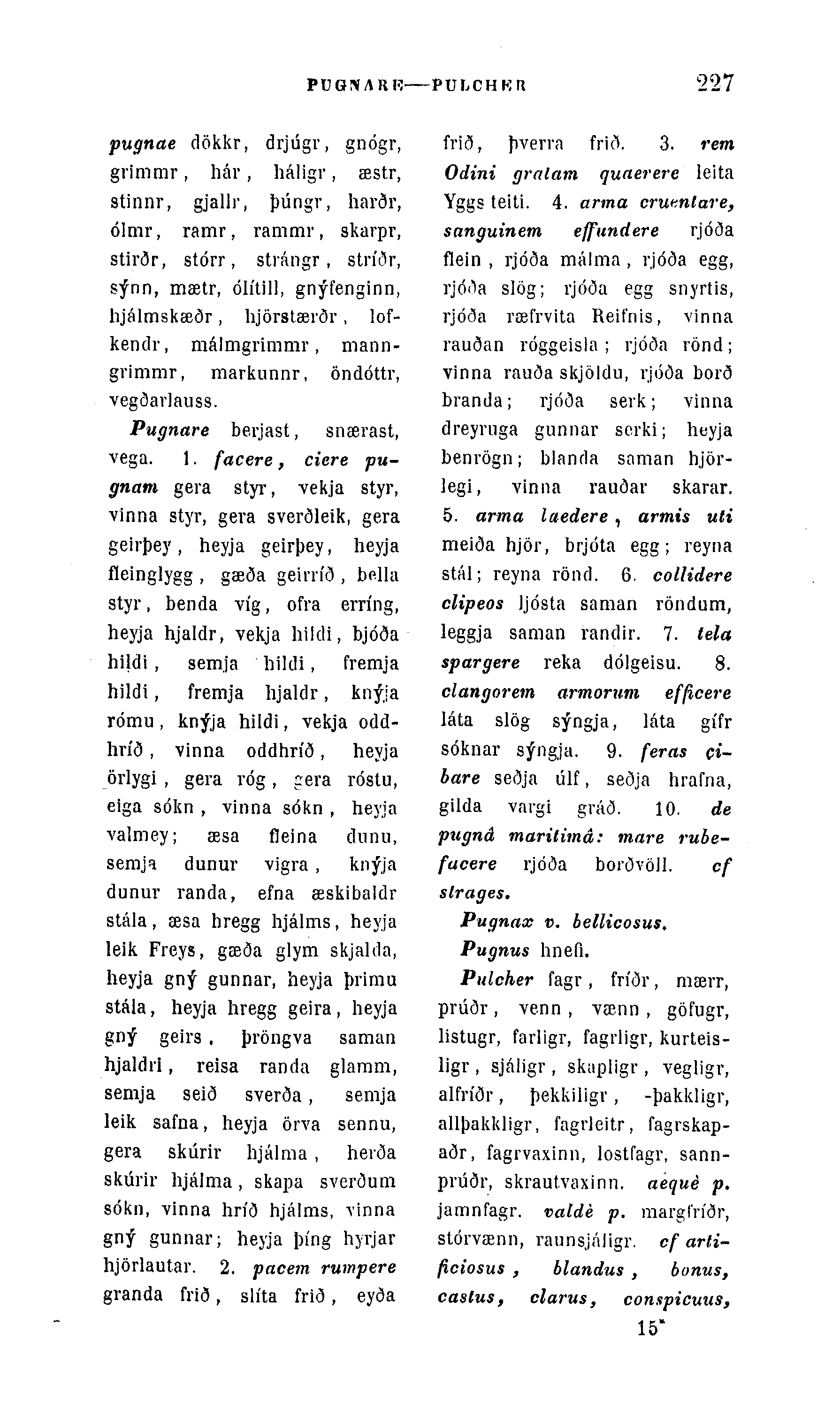 Pugnare berjast, snærast, vega. 1. facere, ciere pu-gnatn gera styr, vekja styr, vinna styr, gera sverðleik, gera geirþey, heyja geirþey, heyja fleinglygg , gæða geiriíð , bella styr, benda víg, ofra erríng, heyja hjaldr, vekja hildi, bjóða hildi, semja liildi, fremja hildi, fremja lijaldr, knýja rómu, knýja hildi, vekja odd-hríð, vinna oddhríð, heyja örlygi , gera vóg , gera róstu, eiga sókn , vinna sókn , heyja valmey; æsa fleina dunu, semji dunur vigra , knýja dunur randa, efna æskibaldr stála, æsa hregg hjálms, heyja leik Freys, gæða glym skjalda, heyja gný gunnar, heyja þrimu stála, heyja hregg geira, heyja gný geirs . þröngva saman hjaldri, reisa randa glamm, semja seið sverða, semja leik safna, heyja örva sennu, gera skúrir hjálma, herða skúrir lijálma, skapa sverðum sókn, vinna hríð hjálms, yinna gný gunnar; heyja þíng hyrjar hjörlautar. 2. pacem rumpere granda frið, slíta frið, eyða