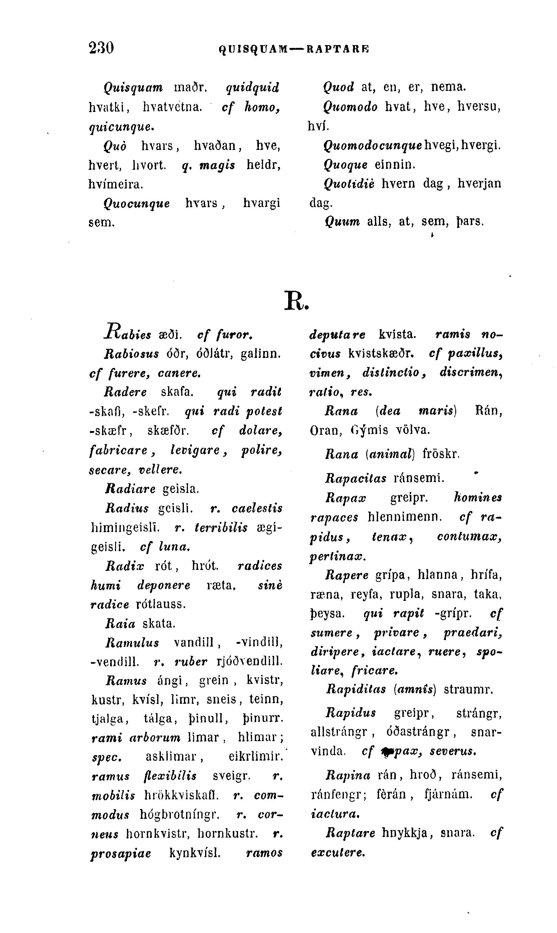 Rapere grípa, hlanna, hrífa, ræna, reyfa, rupla, snara, taka, þeysa. qui rapit -grípr. cf sumere, privare, praedari, diripere, iactare^ ruere, spo-liare, fricare.
