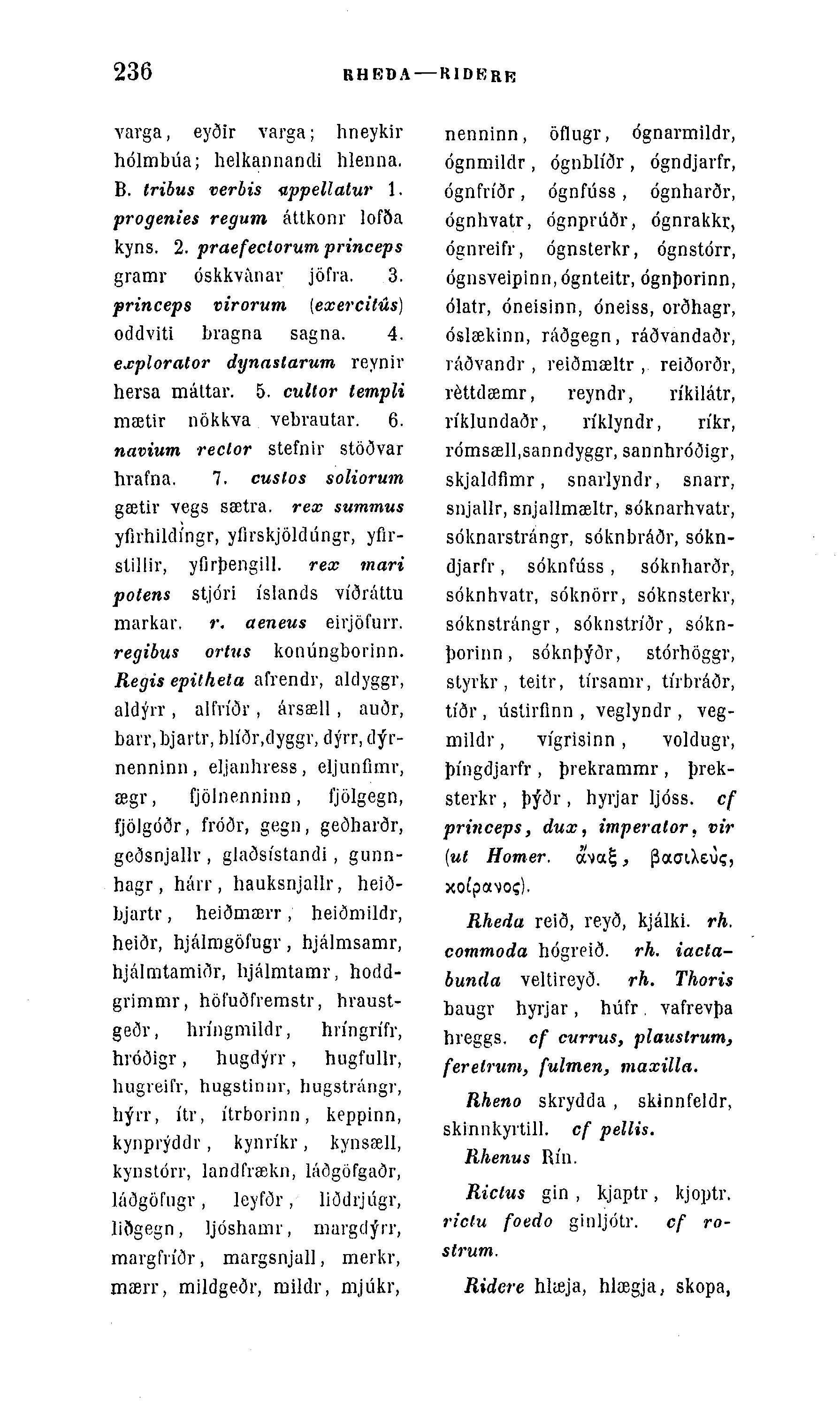 varga, eyðir varga; hneykir hólmbúa; helkannandi hlenna. B. tribus verbis Gppellatw 1. progenies regum áttkonr lofða kyns. 2. praefectorum princeps gramr óskkvánav jöfra. 3. princeps virorum [exercitús) oddviti bragna sagna. 4. explorator dynaslarum reynir hersa máttar. 5. cultor tetnpli mætir nökkva vebvautar. 6. navium reclor stefnir stöðvar hvafna. 7. cuslos soliorum gætir vegs sætra. rex summus yfirhildÃngr, yflrskjöldiingr, yflr-stillir, yfirþengill. rex mari potens stjóri Ãslands vÃðráttu markar. r. aeneus eirjöfurr. regibus ortus konúngborinn. Regis epilheta afrendr, aldyggr, aldýrr , alfvÃðr , ársæll, auðr, bavr, bjartr, blÃðr.dyggr, dýrr, dýr-nenninn , eljanhress, eljunfimr, ægr, fjölnenninn, fjölgegn, fjölgóðr, fróðr, gegn, geðharðr, geðsnjallr , glaðsÃstandi, gunn-hagr , hárr , hauksnjallr, heið-bjartr, heiðmærr, heiðmildr, heiðr, hjálmgöfugr, hjálmsamr, hjálmtamiðr, hjálmtamr, hodd-grimmr, höt'uðfremstr, hraust-geðv, hrÃngmildr, hrÃngrÃfr, hróðigr, hugdýrr, hugfullr, hugreifr, hugstinnv, hugstrángr, hýrr, Ãtr, Ãtrborinn, keppinn, kynprýddr, kynrÃkr, kynsæll, kynstórr, landfrækn, láðgöfgaðr, láðgöfugv, leyfðr, liðdrjúgr, liðgegn, Ijóshamr, margdýir, margfrÃðr, margsnjall, merkr, mæiT, mildgeðr, mildr, mjúkr,
