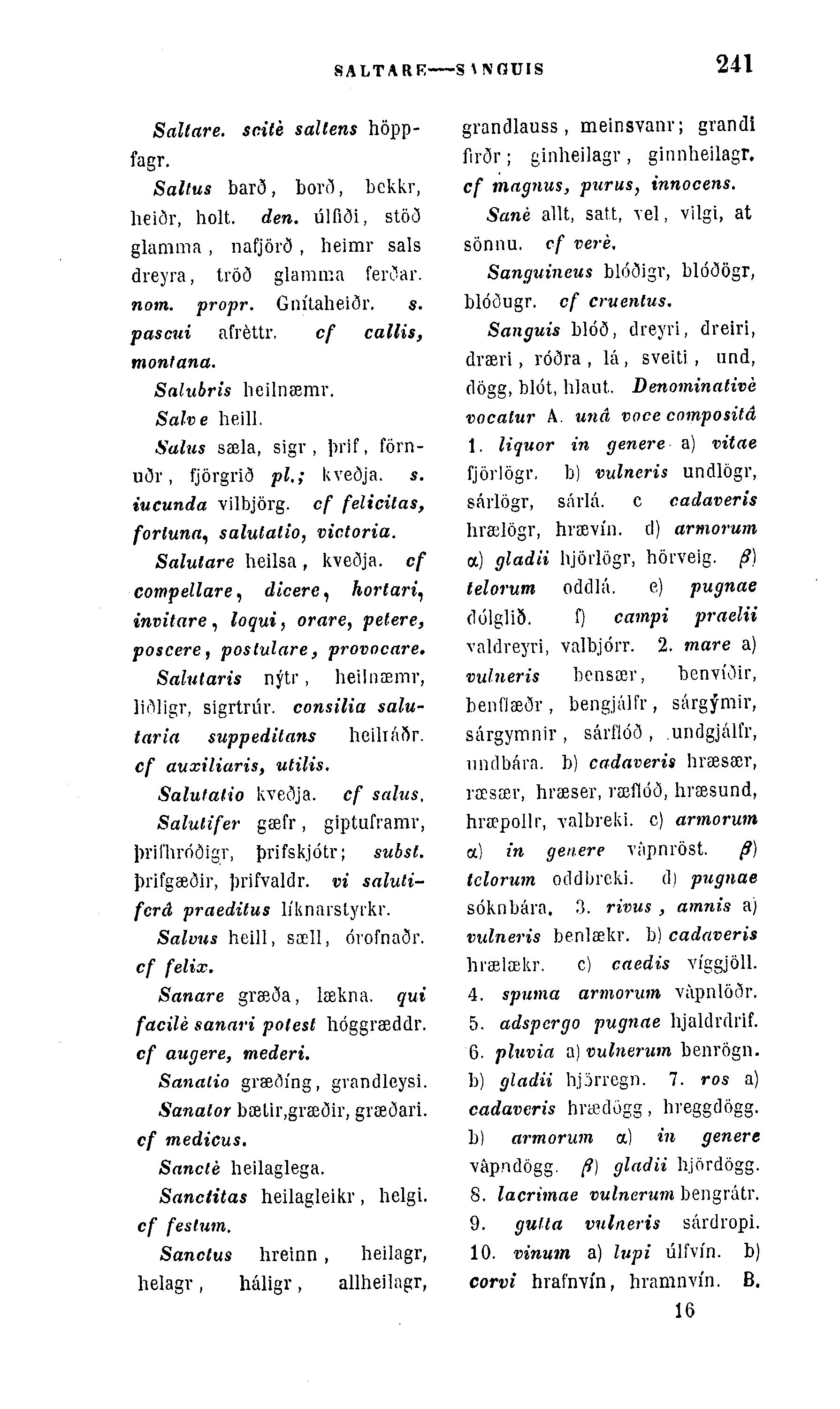 Salus sæla, sigr , þrif, förn-uðr, fjörgrið pl.; kveðja. s. iucunda vilbjörg. cf felicitas, forluna, salutatio, victoria.