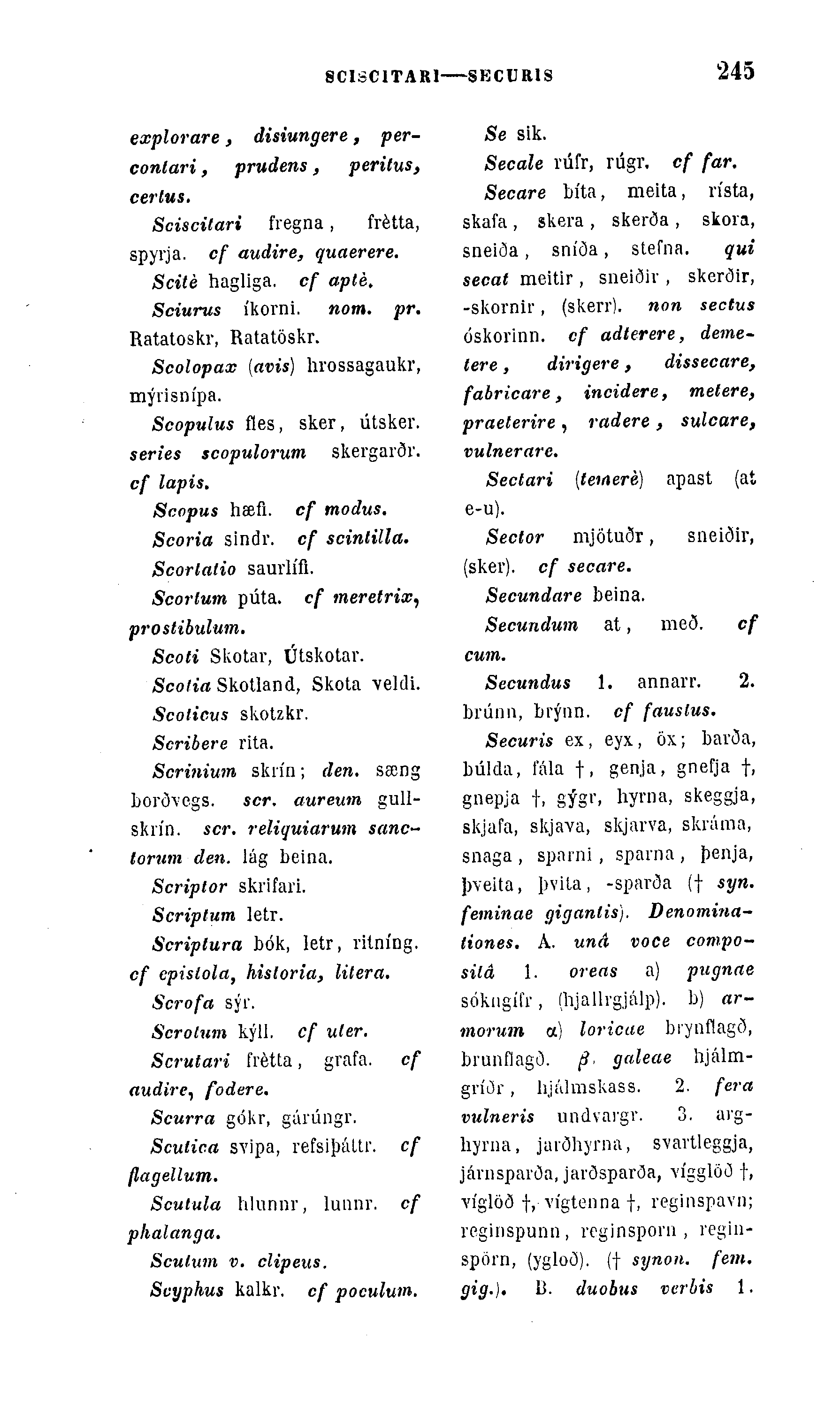 Secale vúfr, rúgr. cf far. Secare bíta, meita, rísta, skafa , skera , skerða , skora, sneiða, sníða, stefna. qui secat meitir , sneiðiv , skerðir, -skornir, (skerr). non sectus óskorinn. cf adterere, deme~ tere, dirigere, dissecare, fabricare „ incidere, metere, praeterire , radere , sulcare, vulnerare.