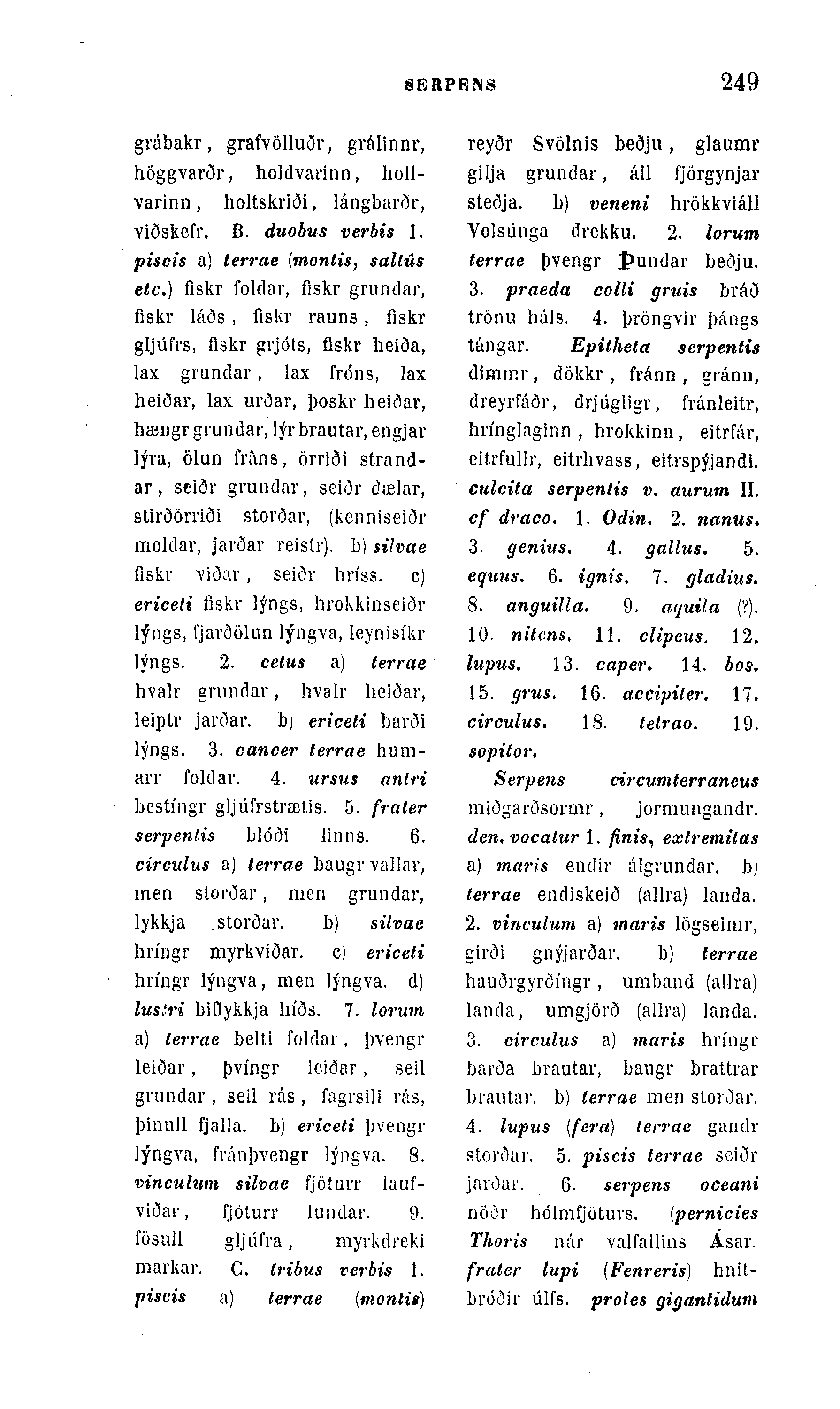 grábakr, grafvölluðv, grálinnr, höggvarðr, holdvarinn, holl-varinn , holtskriði, lángbarðr, viðskefr. B. duobus verbis 1. piscis a) terrae (montis, sallús etc.) flskr foldar, fiskr grundar, fiskr láðs , fiskr rauns , fiskr gljúfrs, fiskr gvjóts, fiskr heiða, lax grundar, lax fróns, lax heiðar, lax urðar, þoskr heiðar, hængr grundar, lýr brautar, engjar lýva, ölun iYáns, örriði strand-ar, sciðr gvundar, seiðr dæJar, stirðörriði storðar, (kenniseiðr moldar, jarðar reistr). b) sihae fiskr viöar, seiðr hrÃss. c) ericeti flskr lýngs, hrokkinseiðr lýngs, fjarðölun lýngva, leynisÃkr lýngs. 2. cetus a) terrae hvalr grundar, hvalr heiðar, leiptr jarðar. b) ericeti barði lýngs. 3. cancer terrae hum-arr foklav. 4. ursus anlri bestÃngr gljúfrstrætis. 5. fraler serpenlis blóöi linns. 6. circulus a) terrae baugr vallar, men storðar, men grundar, lykkja .storðar. b) silvae hrÃngr myrkviðar. o ericeti hrÃngr lýngva, men lýngva. d) lustri biflykkja hÃðs. 7. lorum a) terrae belti foldar, þvengr leiðar, þvÃngr leiðar, seil grundar , seil rás , fagrsili vás, þinull fjalla. b) ericeti þvengr lýngva, fránþvengr lýngva. 8. vinculum silvae fjöturr lauf-viðai-, fjöturr lundar. 9. fösuJl gljdfra, myrkdreki markar. C. Iribus verbis 1. piscis a) terrae (monlie)