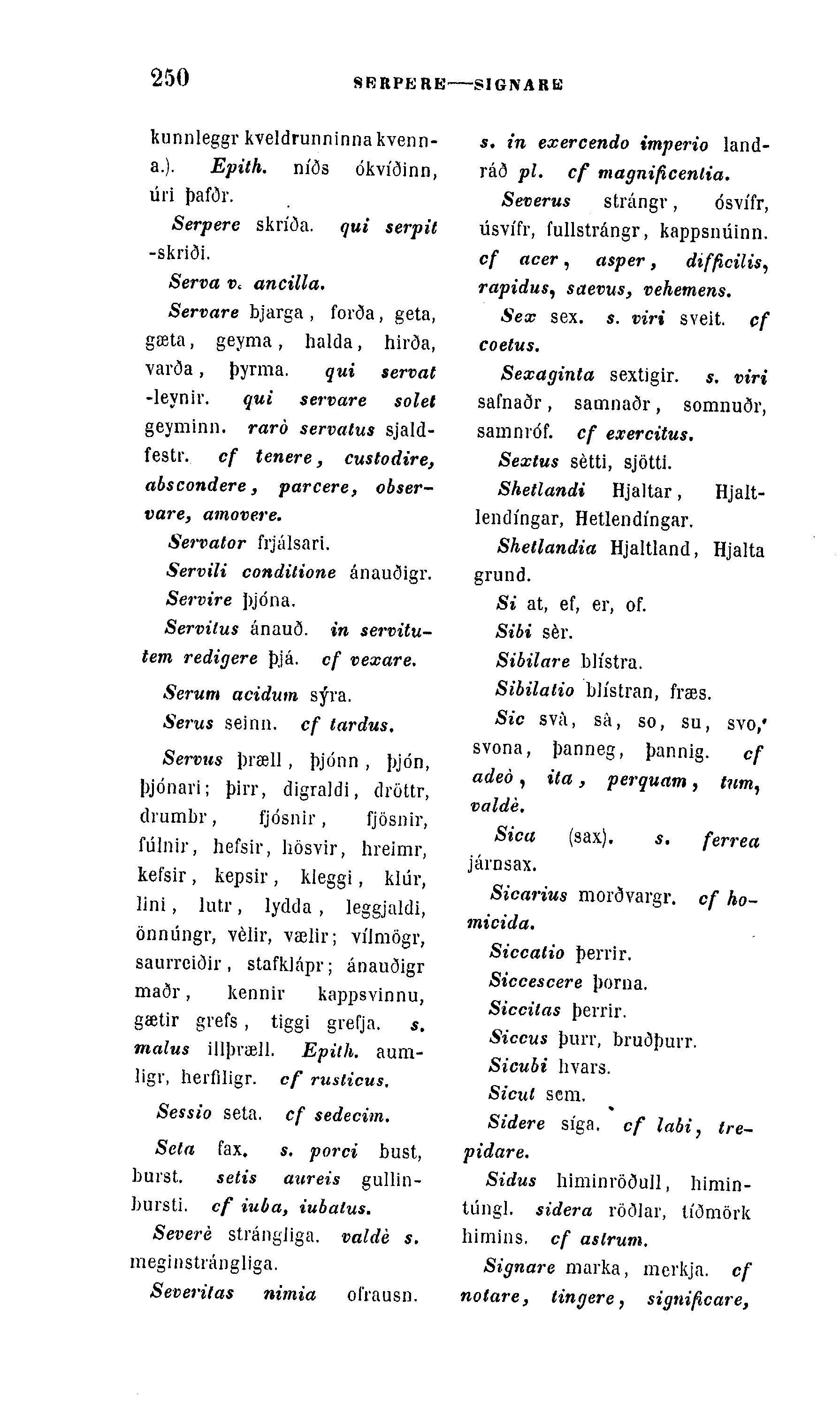 Servus þræll, þjónn , þjón, þjónari; þirr, digraldi, dröttr, drumbr, fjósnir, fjösnir, fúlnir, hefsir, hösvir, hreirnr, kefsir , kepsir , kleggi, klúr, lini, lutr, lydda , leggjaldi, önnúngr, vélir, vælir; vÃlmögr, saurrciðir , stafklápr; ánauðigr maðr, kennir kappsvinnu, gætir grefs, tiggà grefja. s. malus illþræll. Epith. aum-ligr, herfiligr. cf ruslicus.