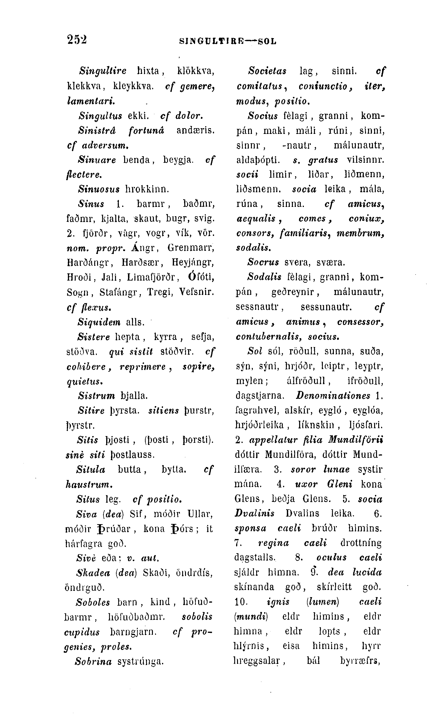 Socius félagi, granni, kom-pán , maki, máli, rúni, sinni, sinnr, -nautr, málunautr, aldaþópti. s. gratus vilsinnr. socii limir, liðar, liðmenn, liðsmenn. socia leika, mála, rúna, sinna. cf amicus, aequalis, cotnes, coniux, consors, familiaris, membrum, sodalis.