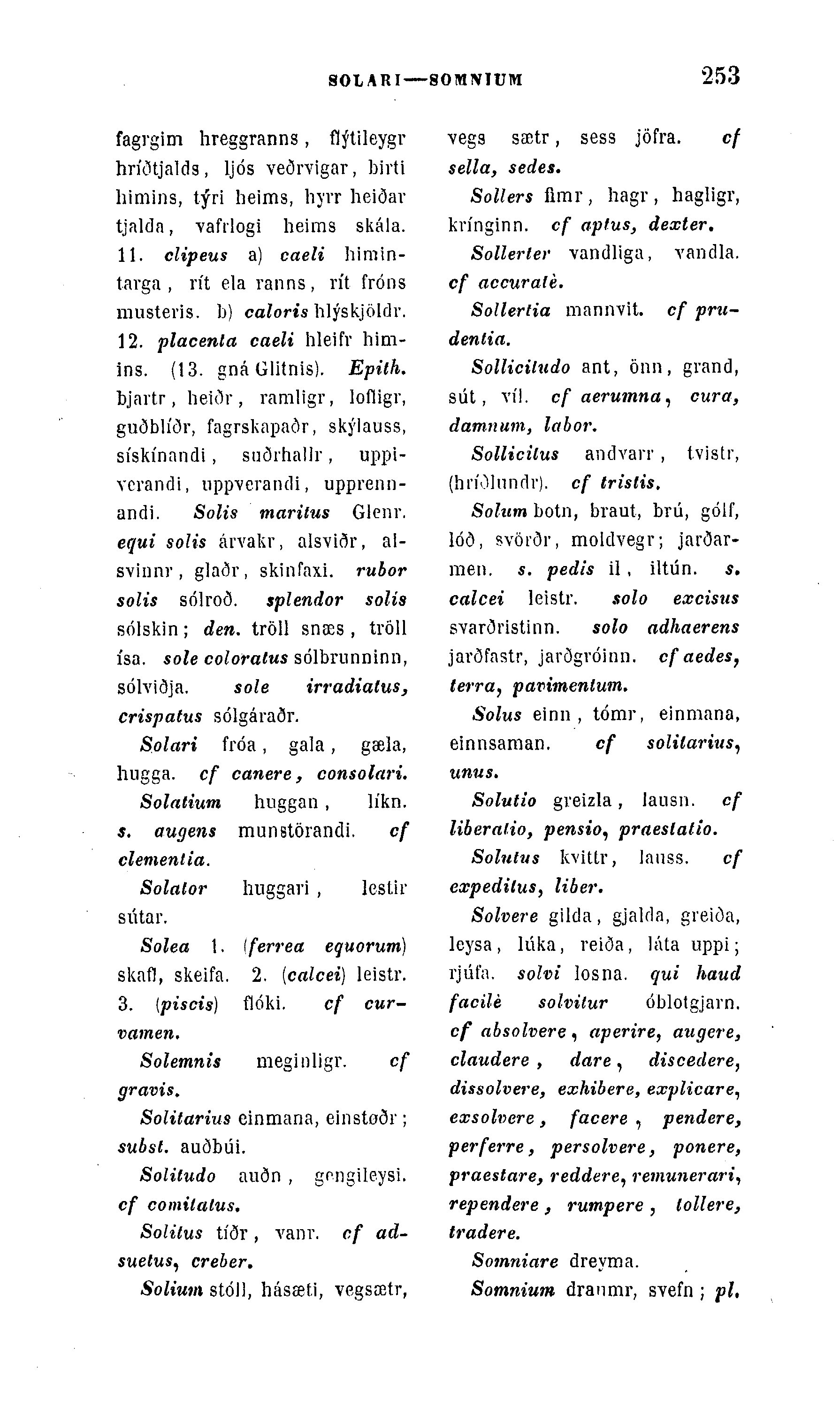 12. placenla caeli hleifr him-ins. (13. gná Glitnis). Epith. bjavtr, heiðr , ramligr, lofligr, guðblÃðr, fagrskapaðr, skýlauss, sÃskÃnandi, suðrhallr, uppi-vcrandi, uppverandi, upprenn-andi. Solis maritus Glenr. equi solis árvakr, alsviðr, al-svinnr , glaðr, skinfaxi. rubor solis sólroð. splendor solis sólskin; den. tröll snæs , tróll Ãsa. sole coloratus sólbrunninn, sólviðja. sole irradiatus, crispatus sólgáraðr.