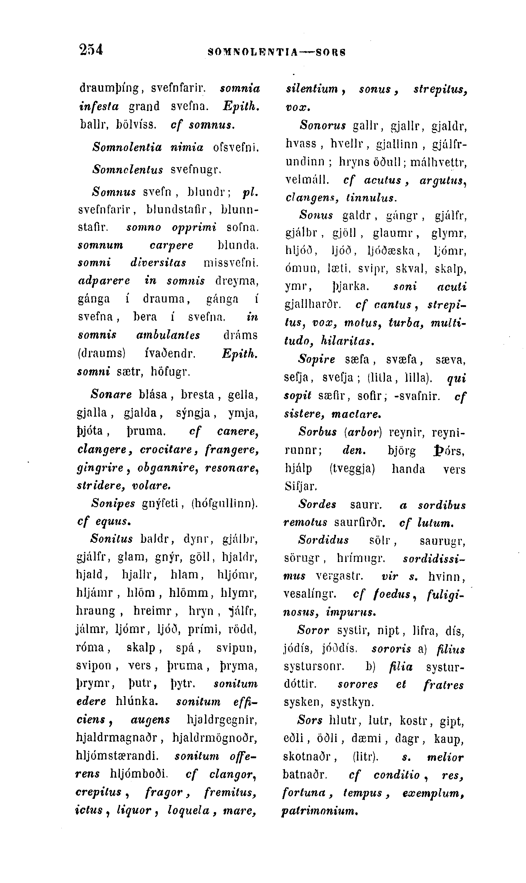 Somnus svefn , blundr; pl. svefnfarir, blundstaflr, blunn-staflr. somno opprimi sofna. somnum carpere blunda. somni diversilas missvcfni. adparere in somnis dreyma, gánga à drauma, gánga à svefna, bera à svefna. in somnis ambulanles dráms (draums) Ãvaðendr. Epith. somni sætr, höfugr.