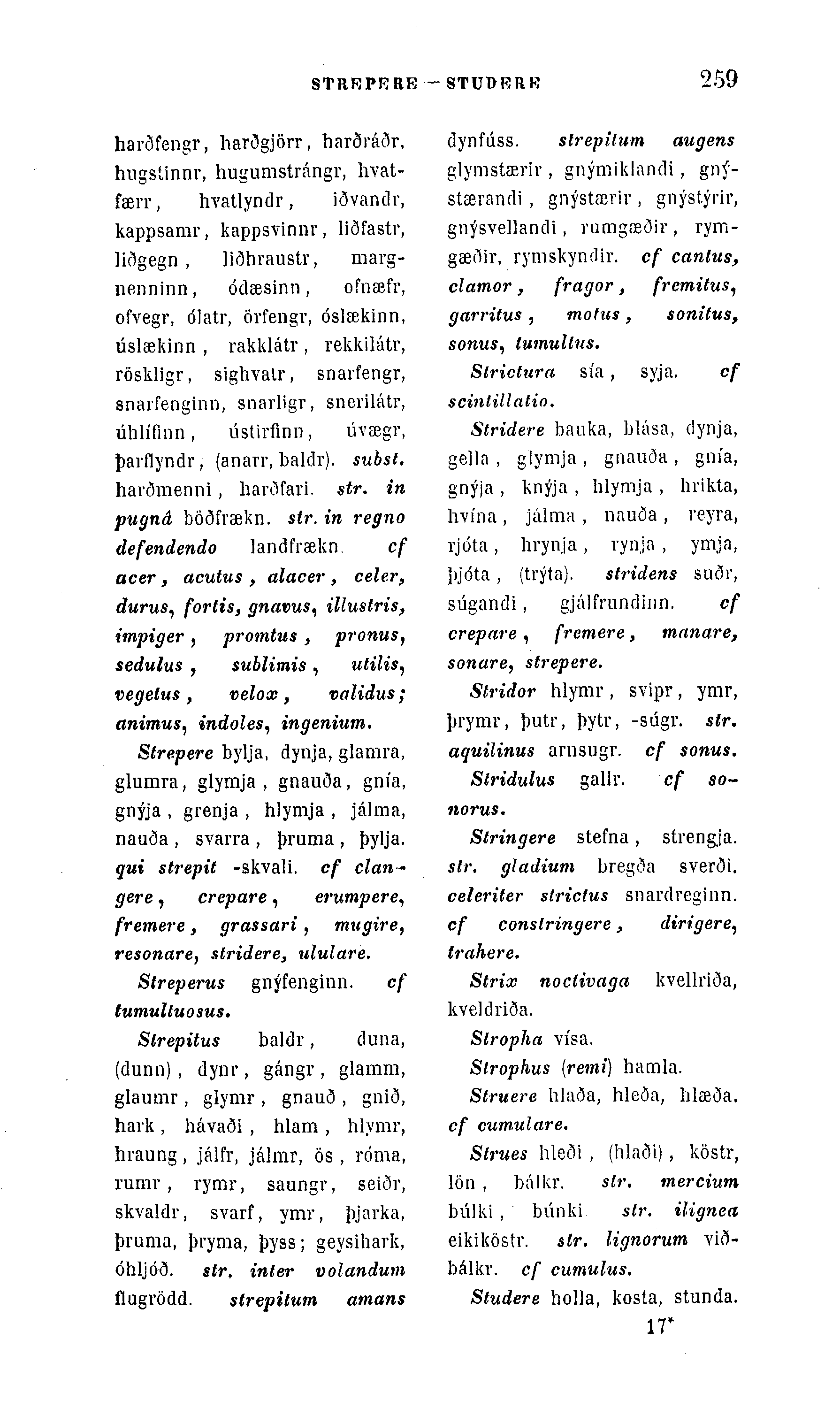 Stridere bauka, blása, clynja, gella , glymja , gnauða , gnÃa, gnýja , knýja , hlymja , hrikta, hvÃna, jálrmi, nauða , reyra, rjóta, hrynja, vynja , ymja, þjóta, (trýta). stridens suðr, súgandi, gjálfrundinn. cf crepare, fremere, manare, sonare, strepere.