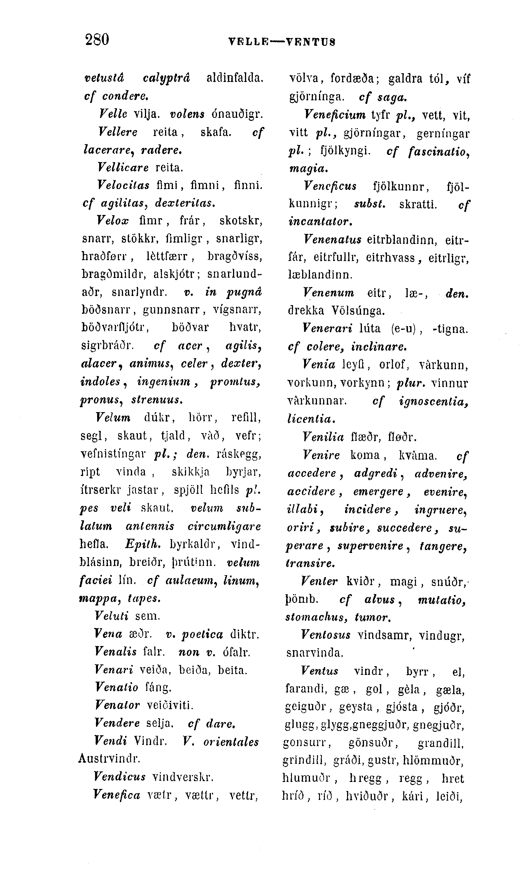 Velum dúkr, hörr, refill, segl, skaut, tjald, víið, vefr; vefnistíngav pl.; den. ráskpgg, ript "vinda , skikkja byrjar, ítrserkv jastar, spjöll hcfils pl. pes veli skaut. vehim sub-lalum anlennis circumligare hefla. Epilh, byrkaldr, vind-blásinn, breiðr, jirútinn. velum faciei lín. cf aulaeum, Hnutn, tnappa, tapes.