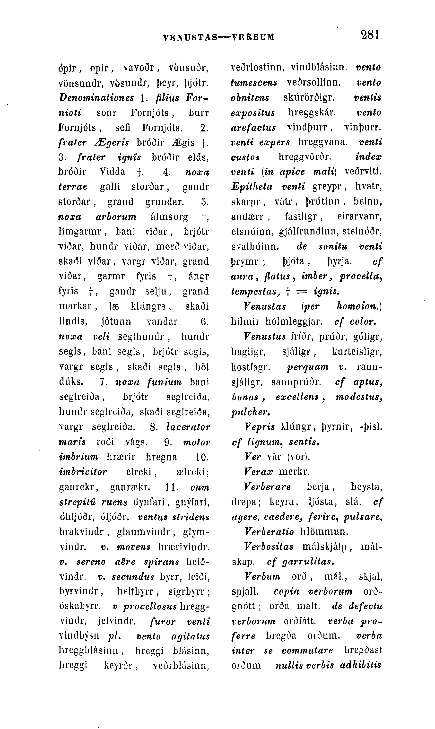 veðrlostinn, vindblásinn. vento tumescens veðrsollinn. vento obnitens skúrörðigr. ventis exposilus hreggskár. vento arefactus vindþuvr, vinþurr. venli expers hreggvana. venti cuslos hreggvörðr. index venti {in apice mali) veðrviti. EpitheÃa venti greypr, hvatr, skarpr , vátr , þrútinn , beinn, andærr , fastligr, eirarvanr, elsnúinn, gjálfrundinn, steinóðr, svalbúinn. de sonitu venti þrymr ; þjóta, þyrja. cf aura, flalus, imber, procella, tempeslaSj f = ignis.