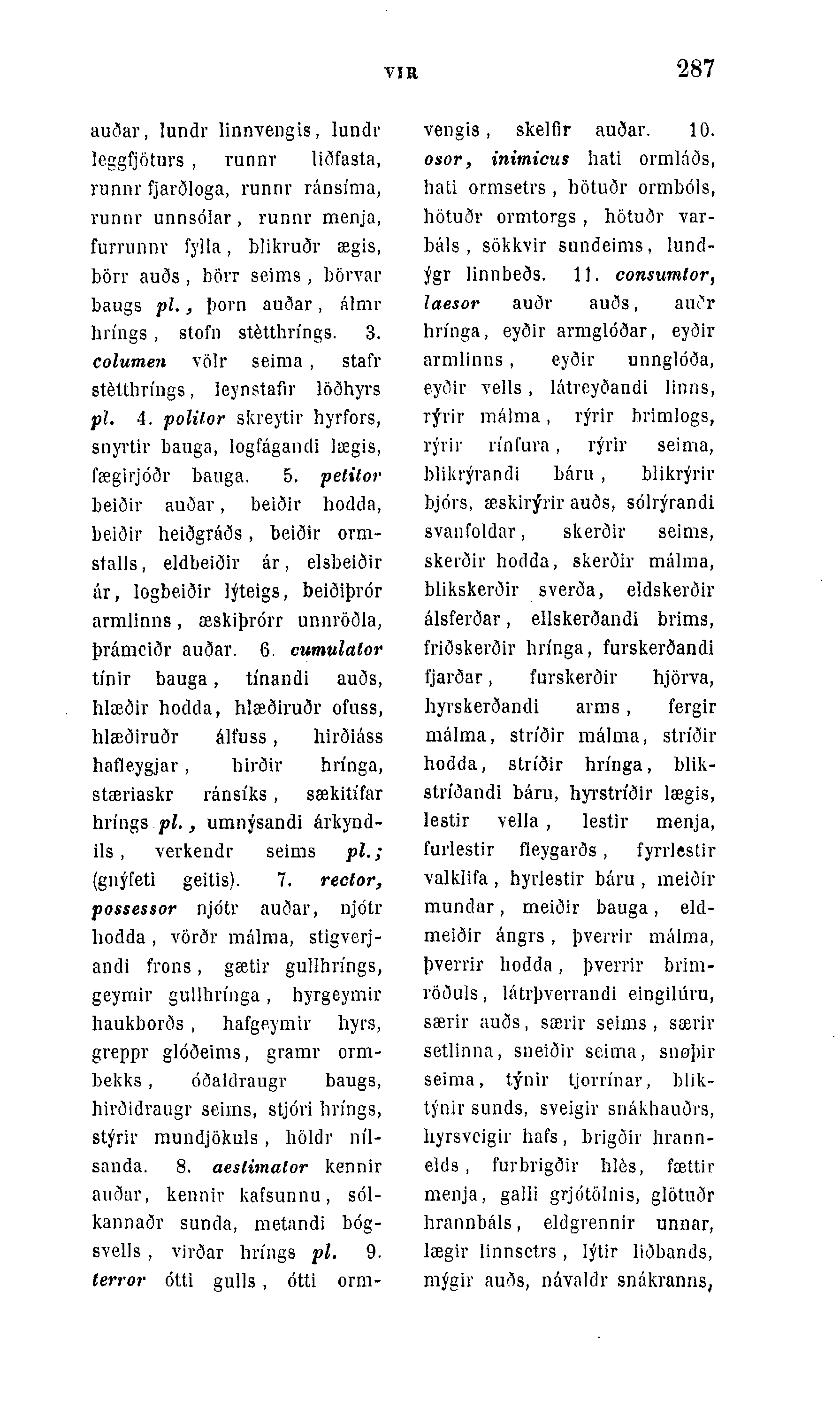 auðar, Iundr linnvengis, lundr leggfjöturs , runnr liðfasta, runnr fjarðloga, runnr ránsÃma, runnv unnsólar , runnr menja, furrunnv fylla, blikruðr ægis, börr auðs , börr seims , börvar baugs pl., þorn auðar, álmr hrÃngs , stofn stétthrÃngs. 3. columen völr seima , stafr stéttbrÃugs, leynstafir löðhyrs pl. 4. politor skreytir hyrfors, snyrtir bauga, logfágandi lægis, fægirjóðr bauga. 5. pelitor beiðir auðar, beiðir hodda, beiðir heiðgráðs, beiðir orm-stalls, eldbeiðir ár, elsbeiðir ár, logbeiðir lýteigs, beiðiþrór armlinns, æskiþrórr unnröðla, þrámciðr auðar. 6. cumulaÃor tÃnir bauga, tÃnandi auðs, hlœðir hodda, hlæðiruðr ofuss, hlæðiruðr álfuss, hirðiáss hafleygjar, hirðir hrÃnga, stæriaskr ránsÃks , sækitÃfar hrÃngs pl., umnýsandi árkynd-ils , verkendr seims pl.; (gnýfeti geitis). 7. rector, possessor njótr auðar, njótr bodda, vörðr málma, stigverj-andi frons, gætir gullhrÃngs, geymir gullbvÃnga, hyrgeyrnir haukborðs , hafgeymir hyrs, greppr glóðeims, gramv orm-bekks , óðaldraugr baugs, hirðidraugr seims, stjóri hrÃngs, stýrir mundjökuls, höldr nÃl-sanda. 8. aeslimalor kennir auðar, kennir kafsunnu, sdl-kannaðr sunda, metandi bóg-SYelIs , virðar hrÃngs pl. 9. terror ótti gulls, ótti orm-