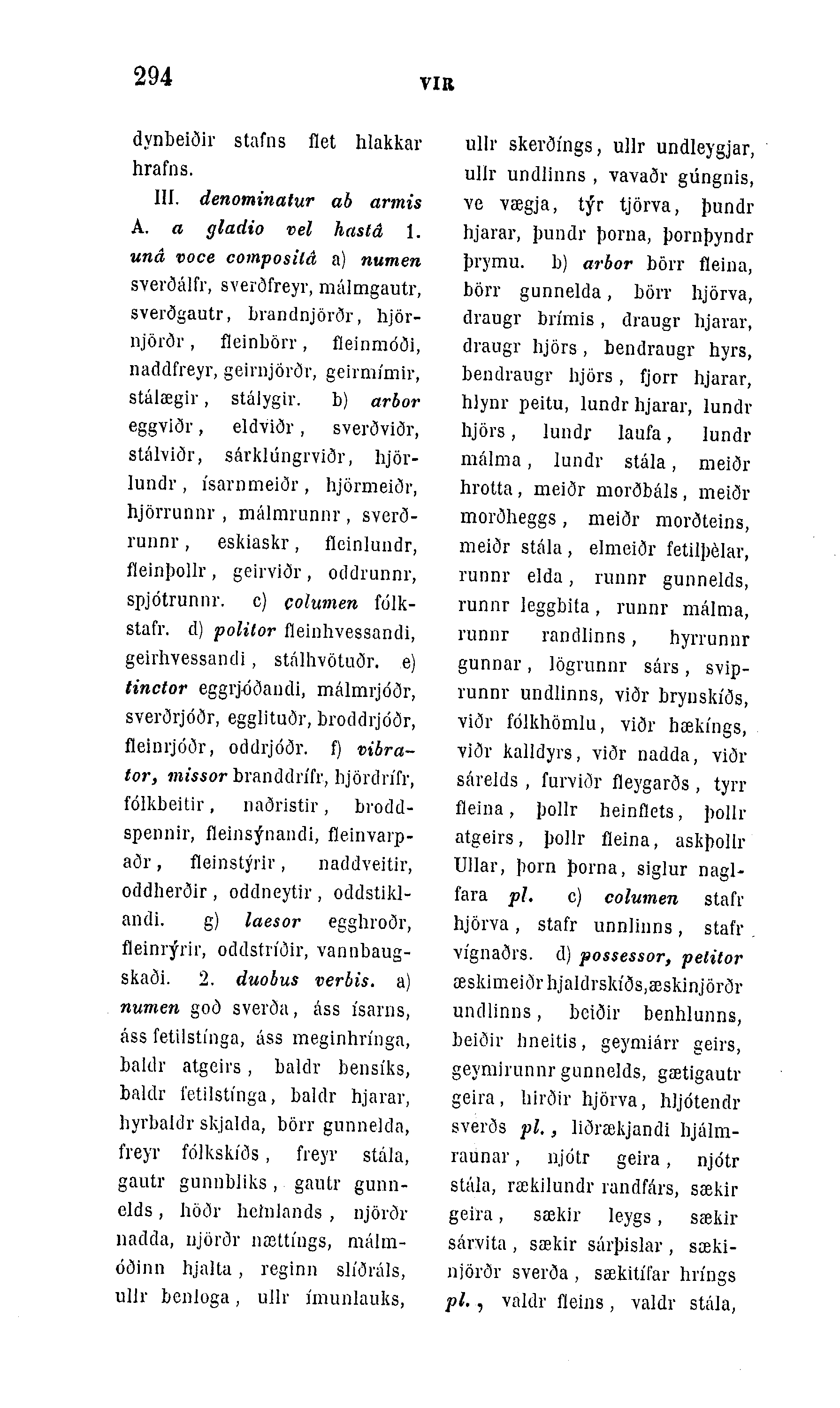 III. denominatur ab armis A. a gladio vel hastá 1. uná voce composilá a) numen sverðálfr, sverðfreyr, málmgautr, sverðgautr, Lrandnjörðr, hjör-njörðr, fleinbörr, fleinmóði, naddfreyr, geirnjörðr, geirmÃmir, stálægir, stálygir. b) arbor eggviðr, eldviðr, sverðviðr, stálviðr, sárklúngrviðr, hjör-lundr , Ãsarnmeiðr, hjörmeiðr, hjörrunnr , málmrunnr, sverð-runnr, eskiaskr, fleinlundr, fleinþolh', geirviðr , oddrunnr, spjótrunnr. c) columen fólk-stafr. d) politor fleinhvessandi, geirhvessandi, stálhvötuðr. e) tinctor eggrjóðandi, málmijóðr, sverðrjóðr, egglituðr, broddrjóðr, fleinrjóðr, oddrjóðr. f) vibra-tor, missor branddrÃfr, lijördrÃfr, fólkbeitir, naðristir, brodd-spennir, fleinsýnandi, fleinvarp-aðr, fleinstýrir, naddveitir, oddherðir , oddneytir , oddstild-andi. g) laesor egghroðr, fleinrýrÃr, oddstn'ðir, vannbaug-skaði. 2. duobus verbis. a) numen goð sverða, áss Ãsarns, áss fetilstÃnga, áss meginhrÃnga, baldr atgeirs, baldr bensÃks, baldr i'etilstÃnga, baldr hjarar, hyrbaidr skjalda, börr gunnelda, freyr fólkskÃðs, freyv stála, gautr gunubliks, gautr gunn-elds, höðr helnlands , njörör nadda, ujörör nættÃugs, máhn-óðinn hjalta, reginn slÃðráls, ulJr benloga, uJlr Ãmunlauks,
