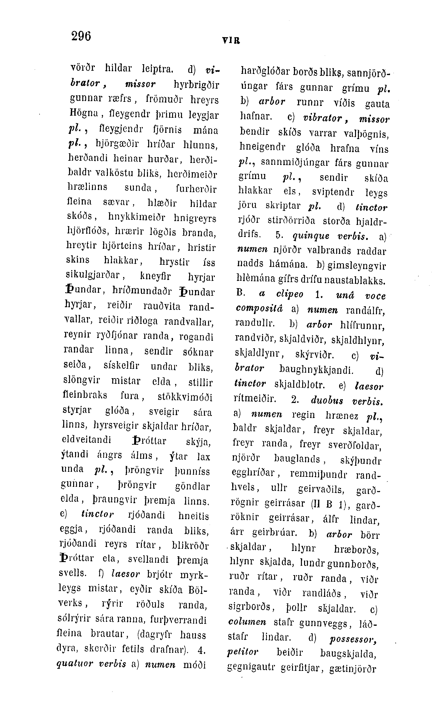 vörðr hildar leiptra. d) vi-brator, tnissor hyrbrigðir gunnar ræfrs , frömuðr hreyrs Högna, fleygendr þrimu leygjar pl. , fleygjendr fjörnis mána pl., hjörgæðir hríðar hlunns, herðandi heinar hurðar, herði-baldr valköstu bliks, herðimeiðr hrælinns sunda, furherðir fleina saovar, hlæðir hildar skóðs, hnykkimeiðr hnigreyrs hjörflóðs, hrærir lögðis branda, hreytir hjörteins hn'ðar, hristir skins hlakkar, hrystiv íss sikulgjarðar, kneyfir hyrjai1 jþundar, hríðmundaðr jjmndar hyrjar, reiðir rauðvita rancl-vallar, reiðir riðloga randvallar, reynir ryðfjónar randa, rogandi randar linna, sendir sóknar seiða, sískelflr undar b]iks, slöngvir mistar elda, stillir íleinbraks fura, stökkvimóði styrjar glóða, sveigir sára linns, hyrsveigir skjaldar hríðar, eldveitandi jþi'óttar skýja, ýtandi ángrs álms, ýtar ]ax unda pl., jiröngvir þunníss gunnar, þröngvir göndlar elda, þraungvir þremja linns. e) tinclor rjóðandi hneitis eggja, rjóðandi randa bliks, rjóðandi reyrs rítar, blikvöðr IÞróttar ela, svellandi þremja svells. f) laesor brjótr myrk-leygs mistar, eyðir skíða Böl-vei'ks, rýrir röðuls randa, sólrýrir sára ranna, furþverrandi íleina brautar, (dagryfr hauss dyra, skcrðir fetils drafnar). 4. quatuor verbis a) numen móði