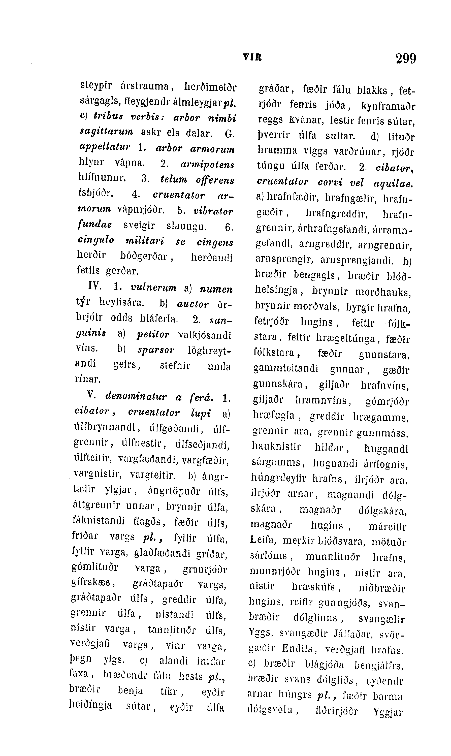 V. denominatur a ferá. 1. cibator, cruenlator lupi a) úlfbrynnandi, úlfgeðandi, úlf-grennir, úlfnestir, úlfseðjandi, úlfteitir, vargfæðandi, vargfæðir, vargnistir, vargteitir. b) ángr-tælir ylgjar, ángrtöpuðr úlfs, áttgrennir unnar, brynnir úlfa, fáknistandi flagðs, fæðir úJfs, friðar vargs pl., fyllir úifa, fyllir varga, glaðfæðandi gn'ðar, gómlituðr varga, granrjóðr gÃfrskæs, gráðtapaðr vargs, gráðtapaðr úlfs, greddir úlfa, grennir úlfa, nistandi úJfs, nistir varga, tannlituði' úlÃ's, verögjafi vargs, vinr varga, pegn ylgs. c) alandi imdar faxa, bræöendr Ã'áki hests pl., bræðÃ