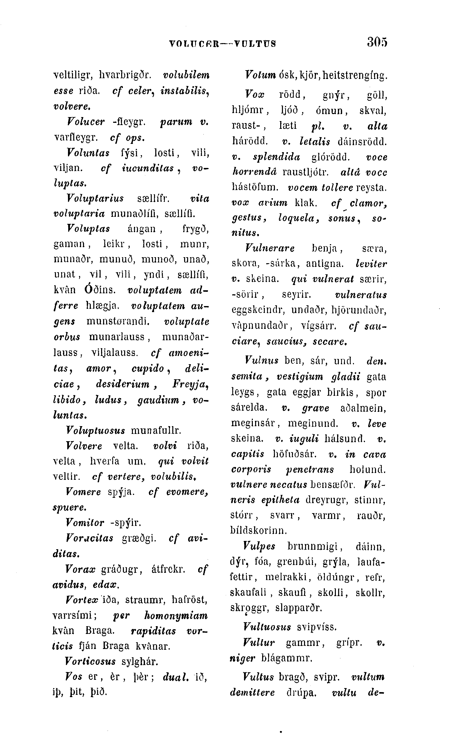 Vox rödd, gnýr, göll, hljómr, Ijóð , ómun, skval, raust-, læti pl. v. alta hárödd. v. letalis dáinsrödd. 13. splendida glórödd. voce horrendá raustljótr. allá vocc liástöfum. vocem tollere reysta. vox avinm klak. cf clamor, gestus, loquela, sonus, so' nitus.